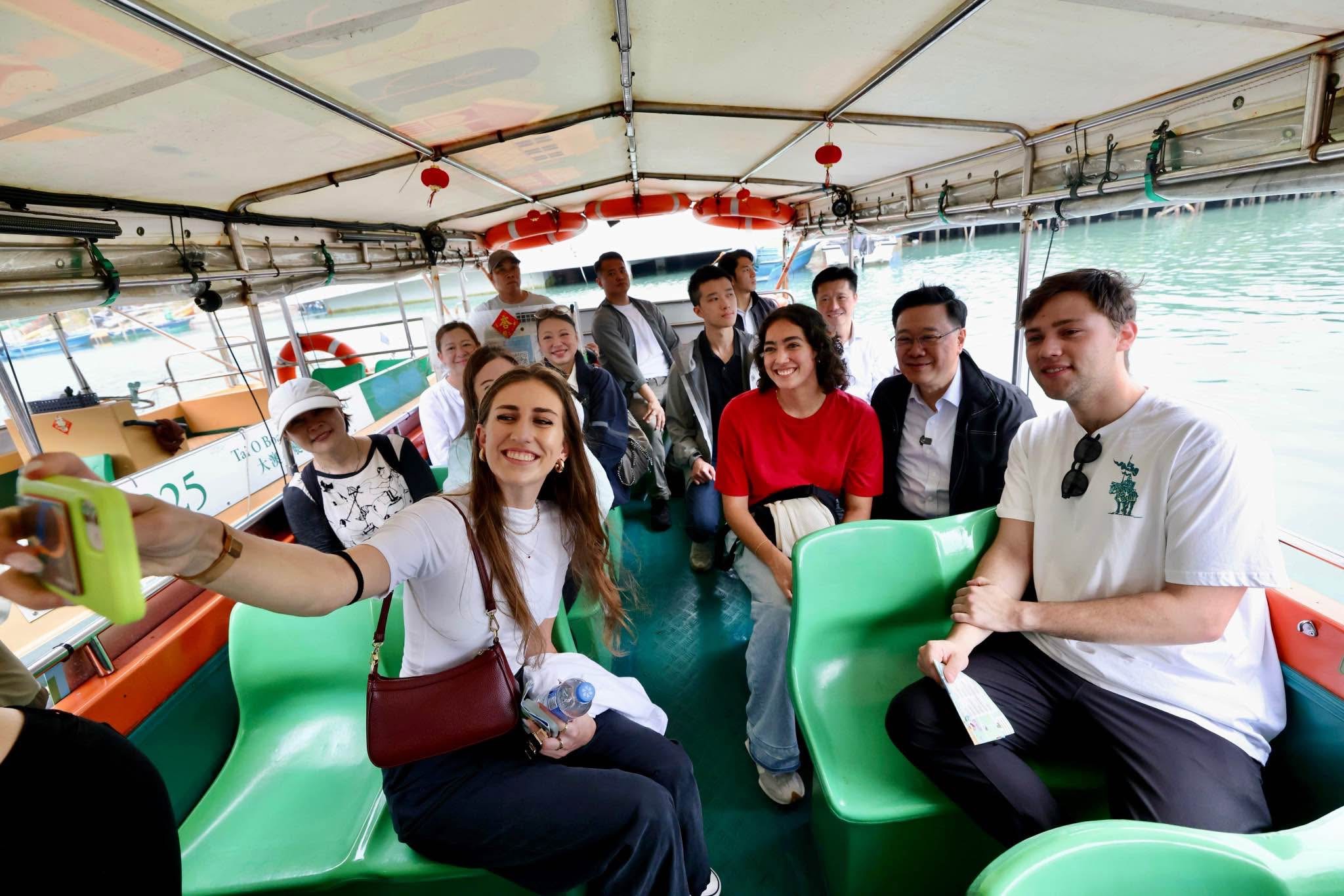 李家超向程小姐推介坐艇欣賞棚屋,麥美娟則幫兩人合照和拍攝短片,程小姐感到十分激動,稱會將難得的影片放上社交平台,又指現在從廣州南站搭高鐵來港很方便,只需約45分鐘,日後會帶更多朋友來港旅遊。
