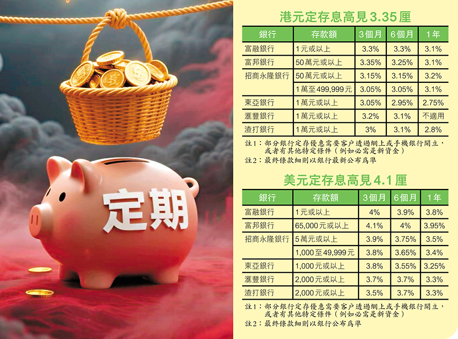 (香港文匯報記者 岑健樂)美國總統特朗普本月初向全球多國徵收所謂「對等關稅」,令環球股市掀起「驚濤駭浪」,港股亦跟隨外圍表現波動,持重貨股民難免膽戰心驚。然而,逆市淘金有竅門,波動下不少人堅守「現金為王」,不論是想「閒錢泊岸」等轉機,抑或是穩守高息抗風暴,香港文匯報今日介紹各大銀行港元及外幣定存的息口,適合不同投資者作參考之用。