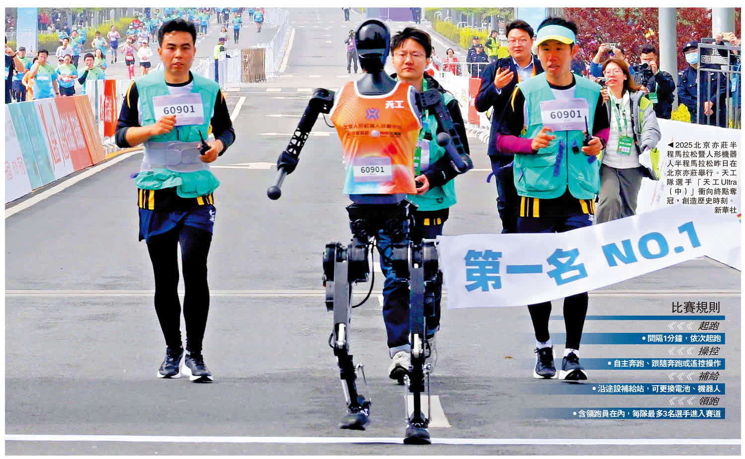 大公報報道。人工智能發展如火如荼。全球首次人類和人形機器人共跑的半程馬拉松賽昨日在北京亦莊舉行。來自北京、上海、廣東等全國各地的20支機器人賽隊展開激烈角逐,最終由1.8米高的國產機器人「天工Ultra」勇奪冠軍。現場不少工程師表示,很開心人生第一個「半馬」跟親手研製的機器人共同完成,未來將加速商用研發,開闢更多應用場景。「跑得快」並非人形機器人發展最終目的,更重要是向「聰明好用」進化。點擊閲讀詳情