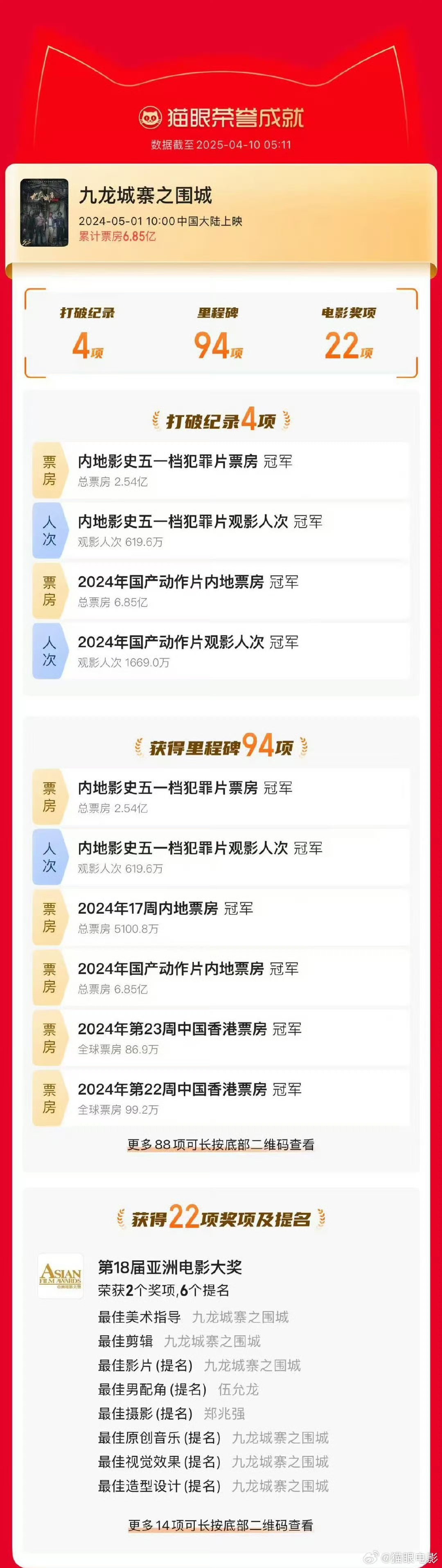 電影由古天樂、洪金寶、任賢齊、林峯、劉俊謙等主演,上映後曾引起全城熱話。據貓眼專業版數據,《九龍城寨之圍城》2024年5月1日首映,截至目前,全球累計票房1.8億美元(約14億港元),其中內地累計票房0.95億美元(約7.4億港元),共打破4項紀錄,獲得94個里程碑成就。此外,電影亦在第43屆香港電影金像獎中獲得14項提名,包括最佳電影、最佳導演等。