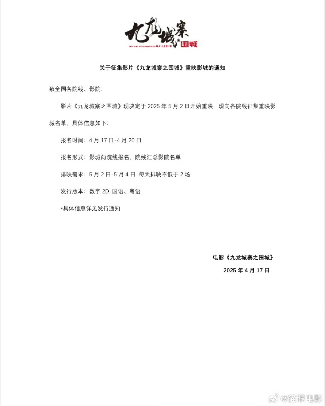 大公文匯全媒體報道,近日,由鄭保瑞導演的電影《九龍城寨之圍城》宣布將在5月2日於內地重映,正式加入五一檔。