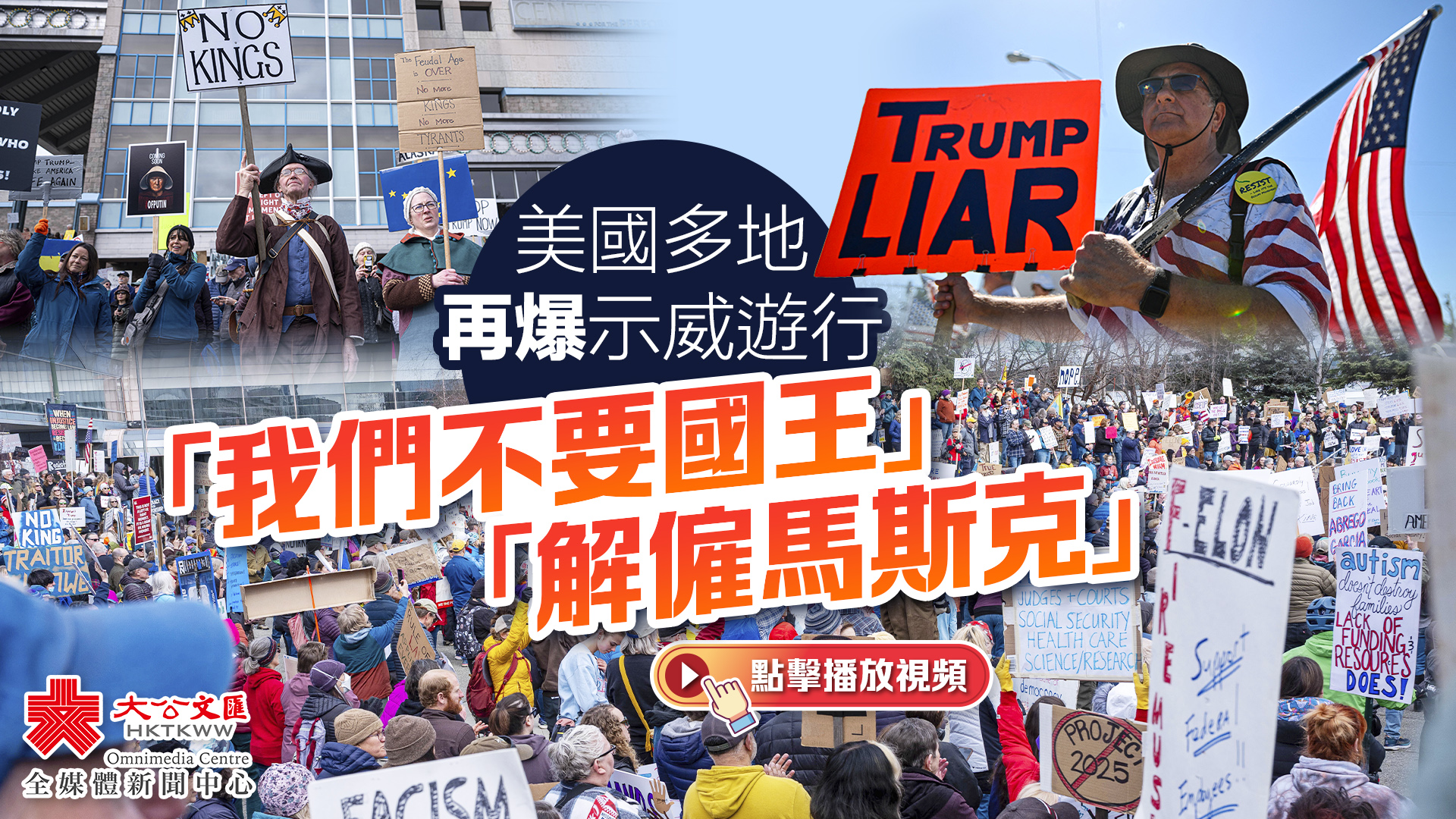 大公文匯全媒體報道,據央視新聞報道,當地時間4月19日,美國紐約、華盛頓等多地再次爆發大規模示威遊行。美國民眾走上街頭,手舉「我們不需要國王」、「解僱馬斯克」、「拒絕接受法西斯政府」等標語,抗議特朗普上任後推出的一系列政策。