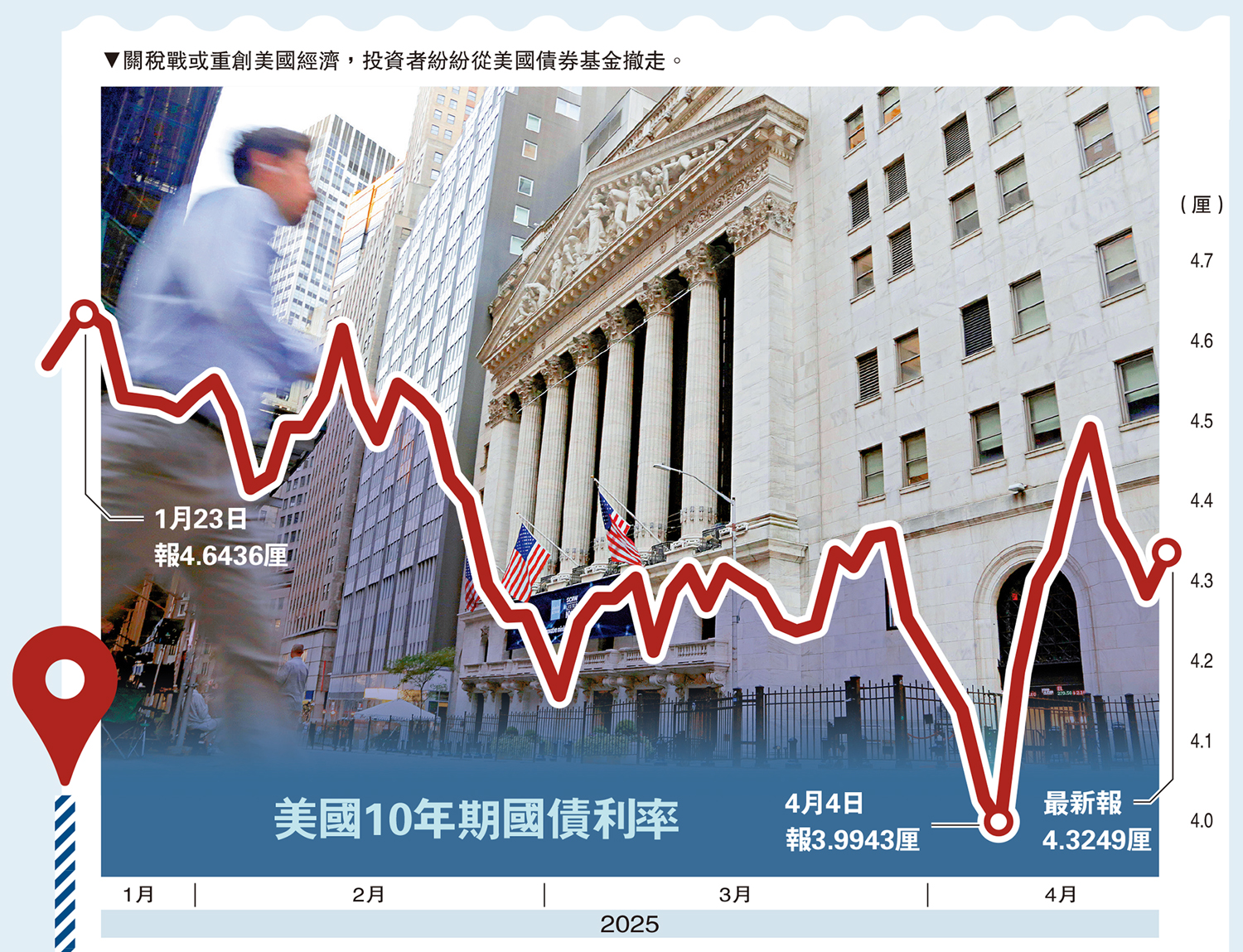 (大公報記者 李耀華)特朗普挑起關稅戰,拖累全球貿易生態,市場預期美國經濟將首當其衝下滑,國際投資者對美失去信心,持續從美元資產抽資。市場統計機構統計顯示,投資者從美國債券基金中共走資117億美元(約913億港元),為連續兩周走資。分析認為,投資者可能不再將美債視為避險或安全資產。有美資投行指出,若聯儲局主席鮑威爾被撤換,勢必令美貨幣政策趨不明朗,市場將更加動盪。