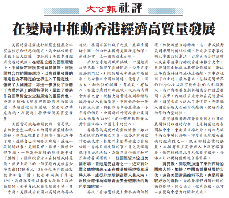 美國的霸道霸凌行徑嚴重擾亂全球貿易秩序和供應鏈穩定,為全球經濟前景投下巨大陰霾,亦加劇了美國本身經濟衰退的風險。在變亂交織的國際環境下,中國堅定維護多邊貿易體制,維護開放合作的國際環境,以高質量發展的確定性為不穩定的世界注入了穩定性,體現了大國擔當,亦進一步強化了香港「內聯外通」的獨特優勢,鞏固了香港作為國際資金安全避風港的重要角色。香港更積極主動參與國際國內兩個循環,持續優化營商環境,完全可以轉危為機,在變局中推動經濟高質量發展。