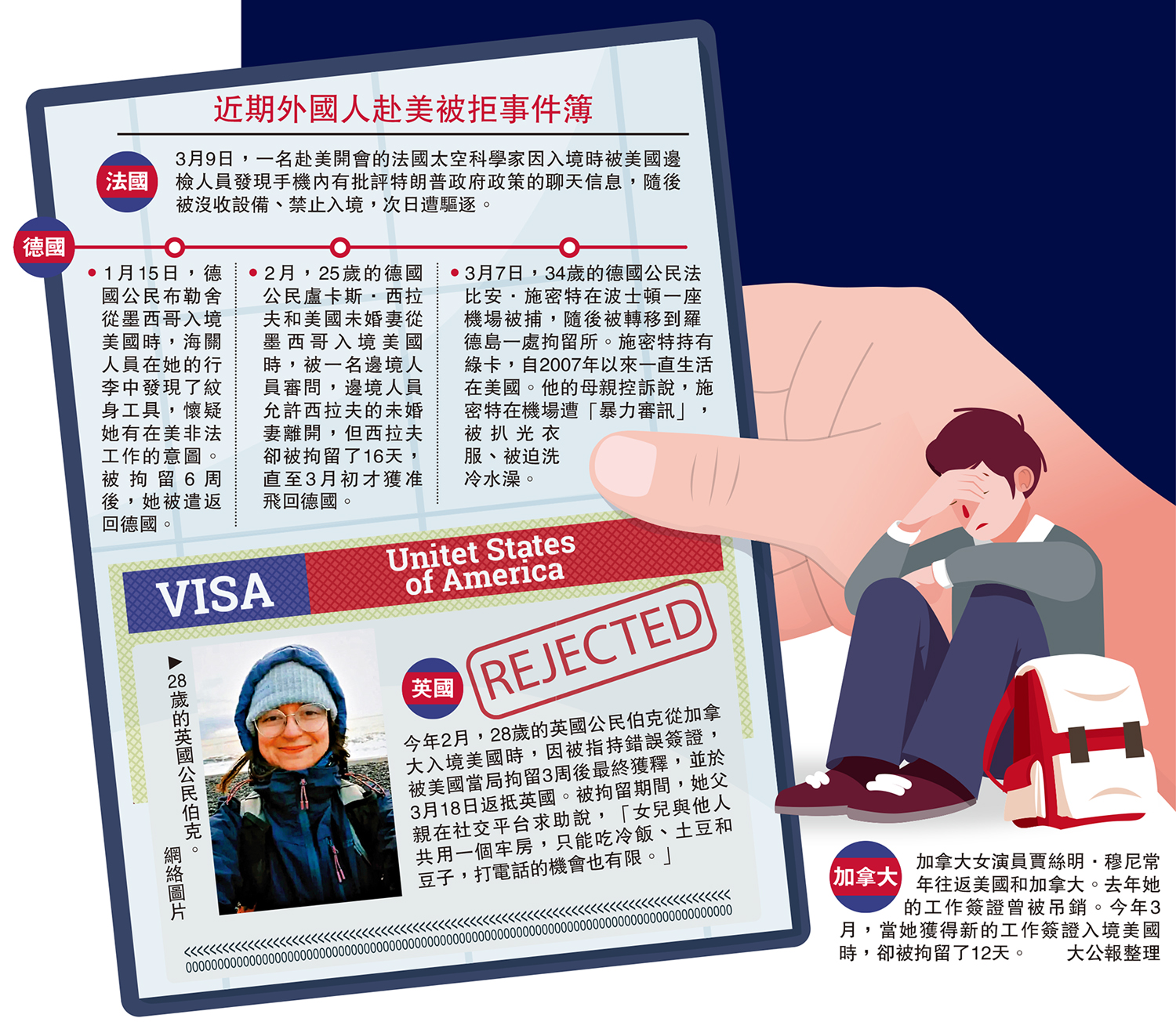 3月下旬,美國國務卿魯比奧表示,已有超過300個簽證被撤銷,「主要是學生簽證,一些是旅遊簽證。」除了簽證可能被無理取消,持有有效護照、簽證的外國人,在美國邊境海關也有可能面對咄咄逼人的審問,甚至被拘押,並遣返回國。評論指,入境美國已變成一項「高危行為」。