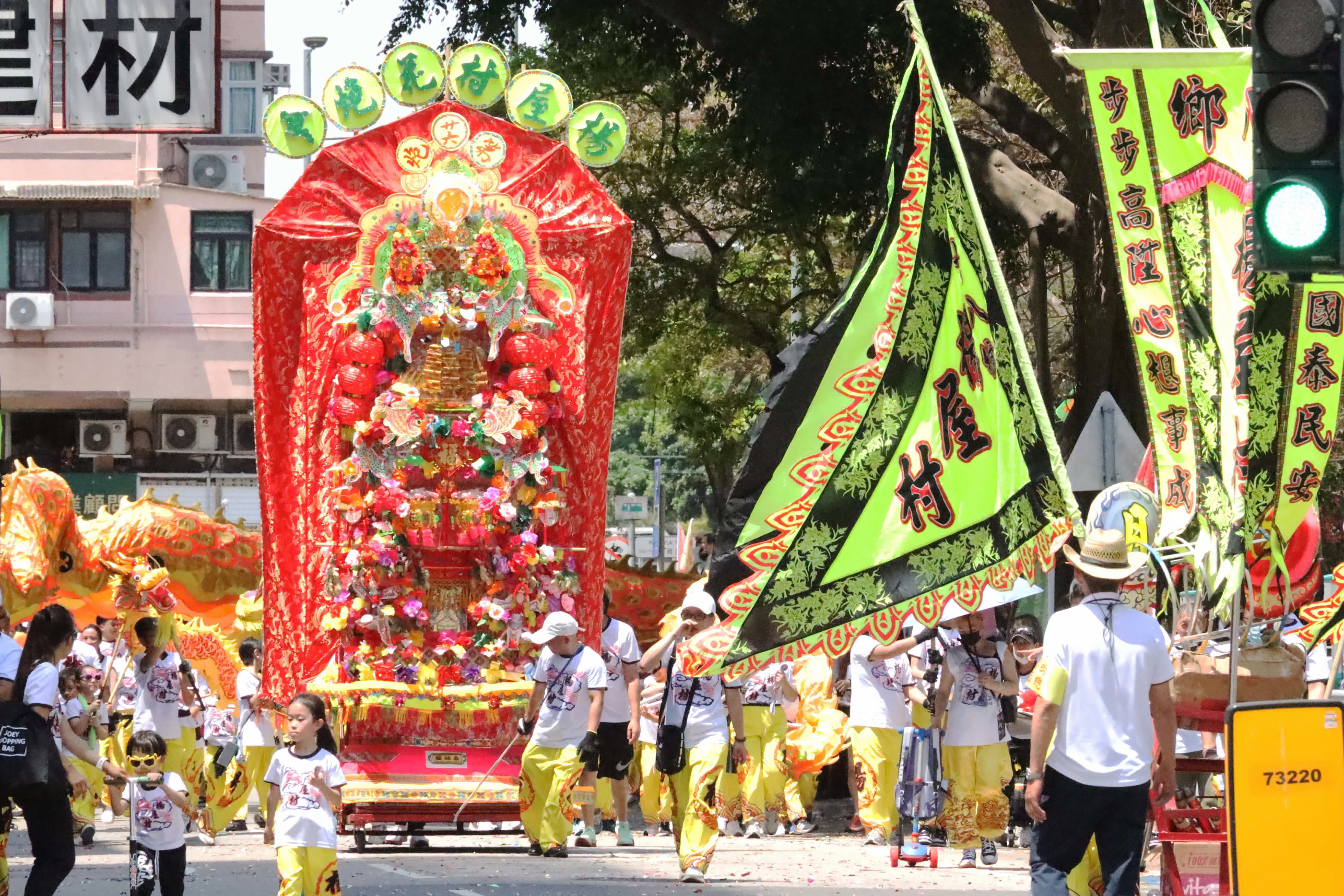 (大公報記者 王亞毛、何嘉駿)昨日是農曆三月廿三日天后誕,香港多區舉辦傳統慶祝活動。具有圍村文化特色的元朗十八鄉天后寶誕會景巡遊在元朗市中心舉行,巡遊合共37支花炮隊及表演隊伍,舞龍舞獅、英歌舞齊上陣,吸引大批市民到場觀看,與巡遊隊伍和今年新加入的熊貓吉祥物合影留念。