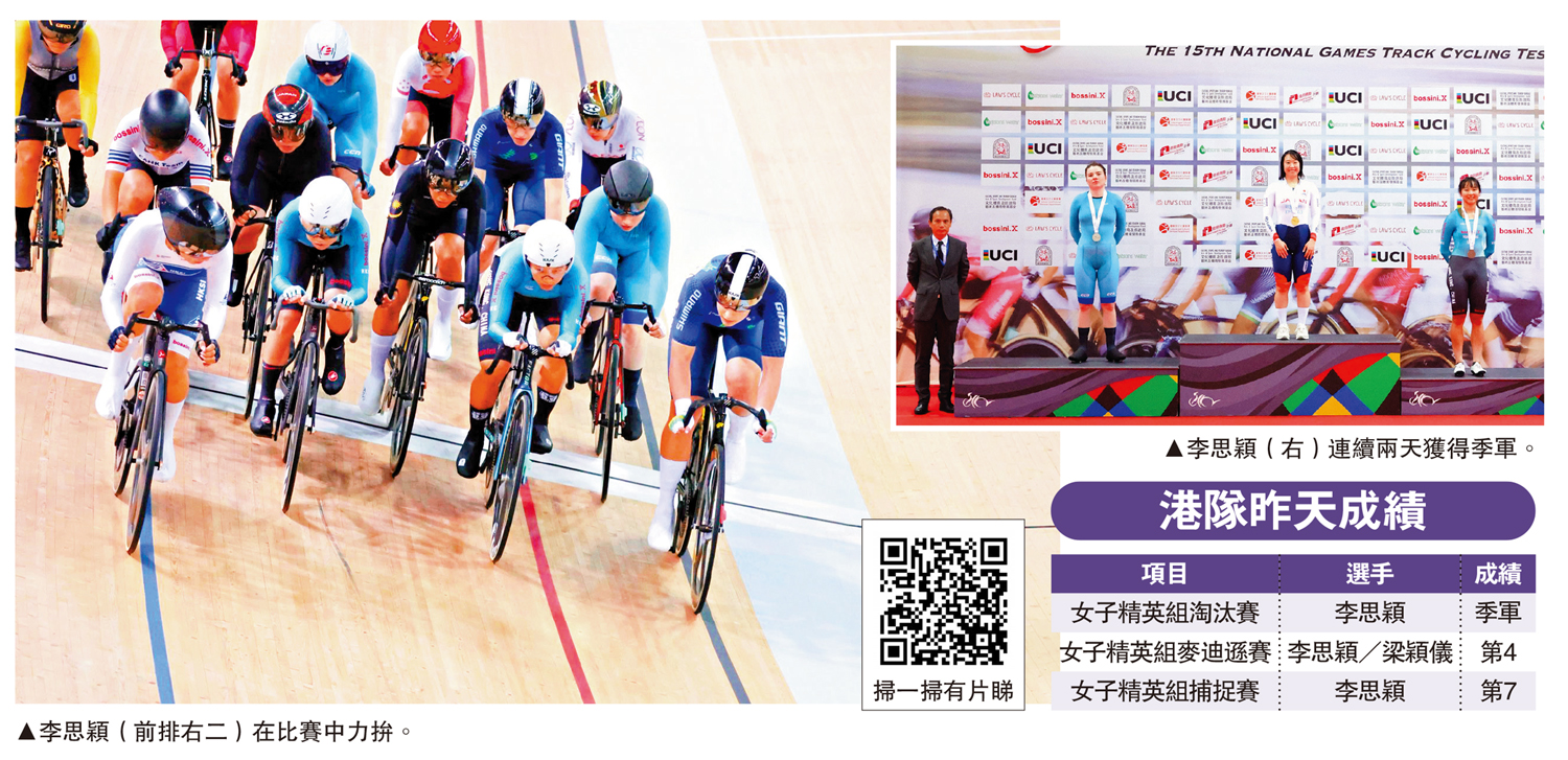 (大公報記者 朱家立)香港國際場地盃暨第15屆全運會場地單車測試賽昨天在香港單車館舉行次天賽事,中國香港隊車手李思穎分別出戰女子精英組捕捉賽及淘汰賽,雖然先在捕捉賽僅第7名完成,但之後收拾心情出戰淘汰賽,最終獲得季軍。另外,她夥拍隊友梁穎儀出戰女子麥迪遜賽取得第4。賽後,李思穎表示自己發揮一般,並會總結經驗,盡力在今天煞科日上演的「香港國際場地盃Ⅱ」的全能賽,爭取再度站上領獎台。