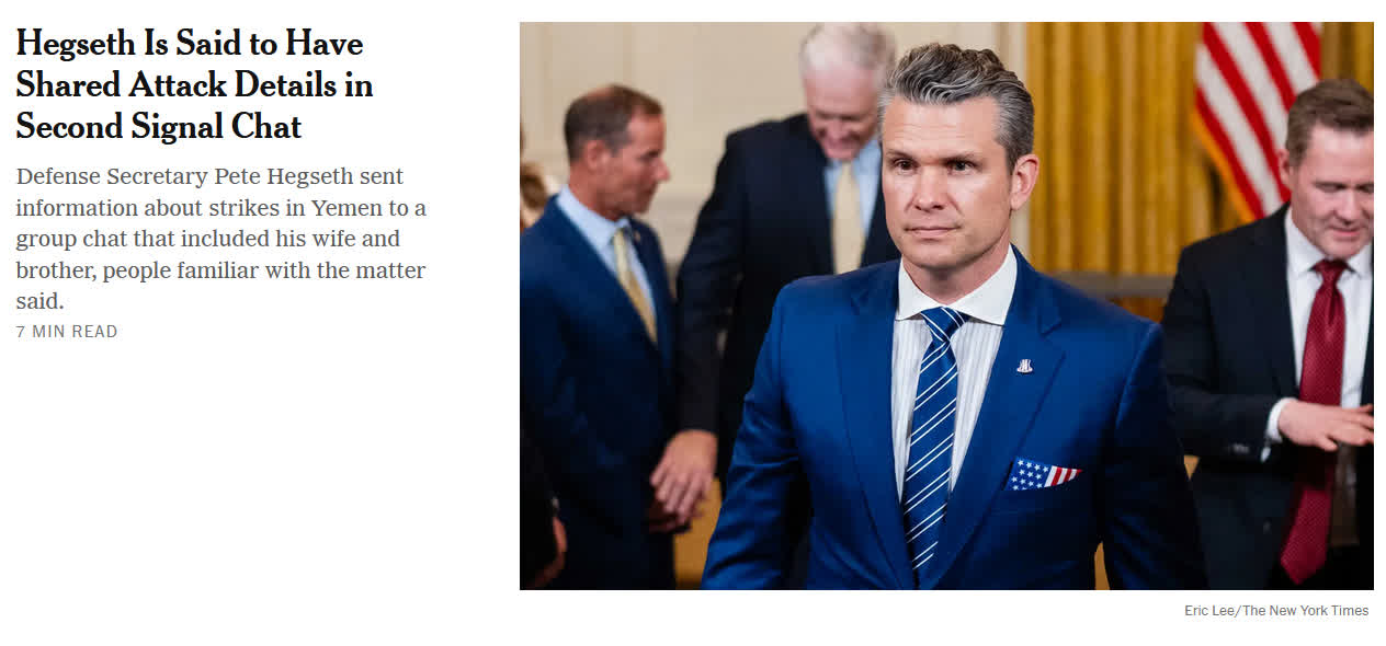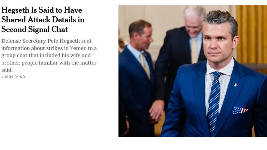 據CCTV國際時訊報道,當地時間4月20日,據《紐約時報》等多家美國媒體援引知情人士消息報道,美國國防部長赫格塞思3月15日在一個私人Signal(信號)聊天群中提前洩露了美軍即將對也門發動空襲的信息,包括美軍F/A-18「大黃蜂」戰機的飛行時間表。