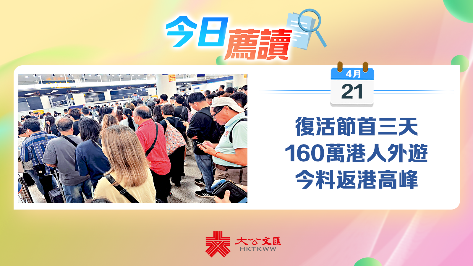 大公報報道。復活節假期迎來尾聲,昨日截至晚上9時,共有約105.6萬人次出入境,出境人次達49.3萬,當中香港居民佔約36.1萬;入境人次則有約56.3萬,當中香港居民佔44.2萬。運輸署預計,今日(21日)將有較多跨境旅客使用各陸路管制站回港,預計在返港高峰時間的公共運輸需求會較高,乘客候車時間亦會較長,呼籲旅客及早計劃行程。點擊閲讀詳情