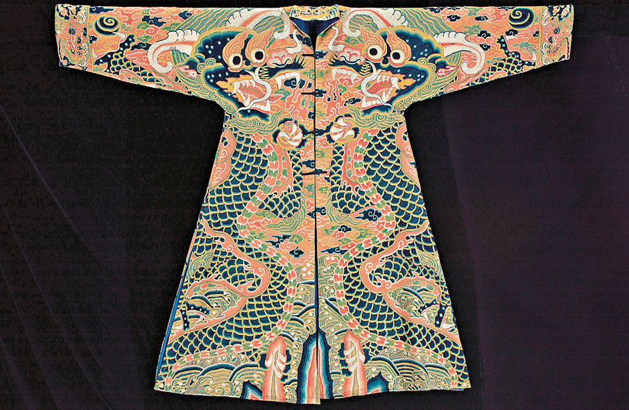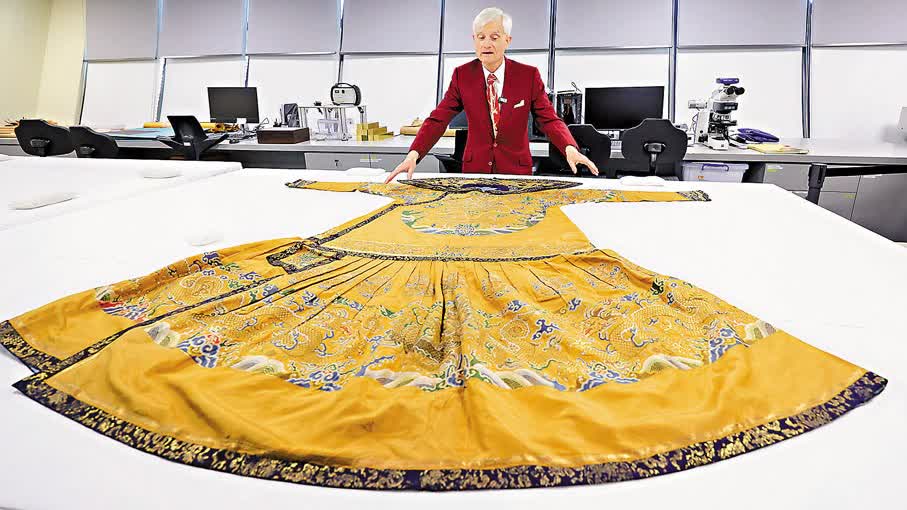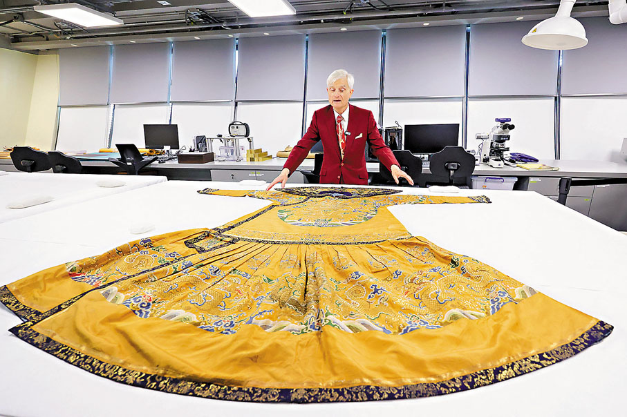 賀祈思最喜歡的藏品,是一件明永樂年間的龍袍,「這可能是現存最古老的中國龍袍,保留了大部分原始色彩」,他半興奮半惋惜地說:「更早年的龍袍已被發掘出來,但已經變色並被污染,幸而這件龍袍上的龍依舊靈動有力、神采飛揚,而且是採用精細的點針刺繡法(petit point),由超過一百萬針交織而成。」