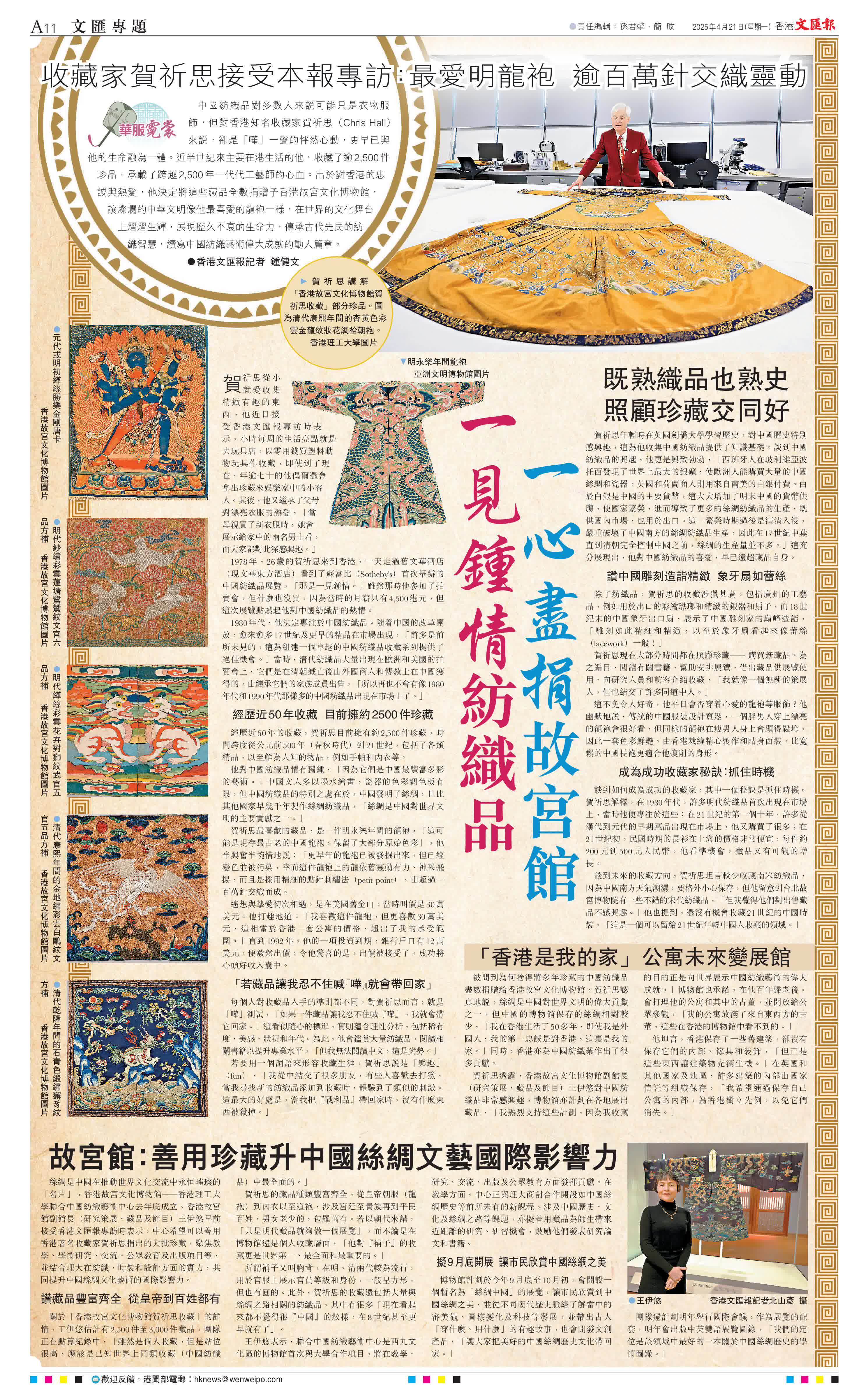 (香港文匯報記者 鍾健文)中國紡織品對多數人來說可能只是衣物服飾,但對香港知名收藏家賀祈思(Chris Hall)來說,卻是「嘩」一聲的怦然心動,更早已與他的生命融為一體。近半世紀來主要在港生活的他,收藏了逾2,500件珍品,承載了跨越2,500年一代代工藝師的心血。出於對香港的忠誠與熱愛,他決定將這些藏品全數捐贈予香港故宮文化博物館,讓燦爛的中華文明像他最喜愛的龍袍一樣,在世界的文化舞台上熠熠生輝,展現歷久不衰的生命力,傳承古代先民的紡織智慧,續寫中國紡織藝術偉大成就的動人篇章。