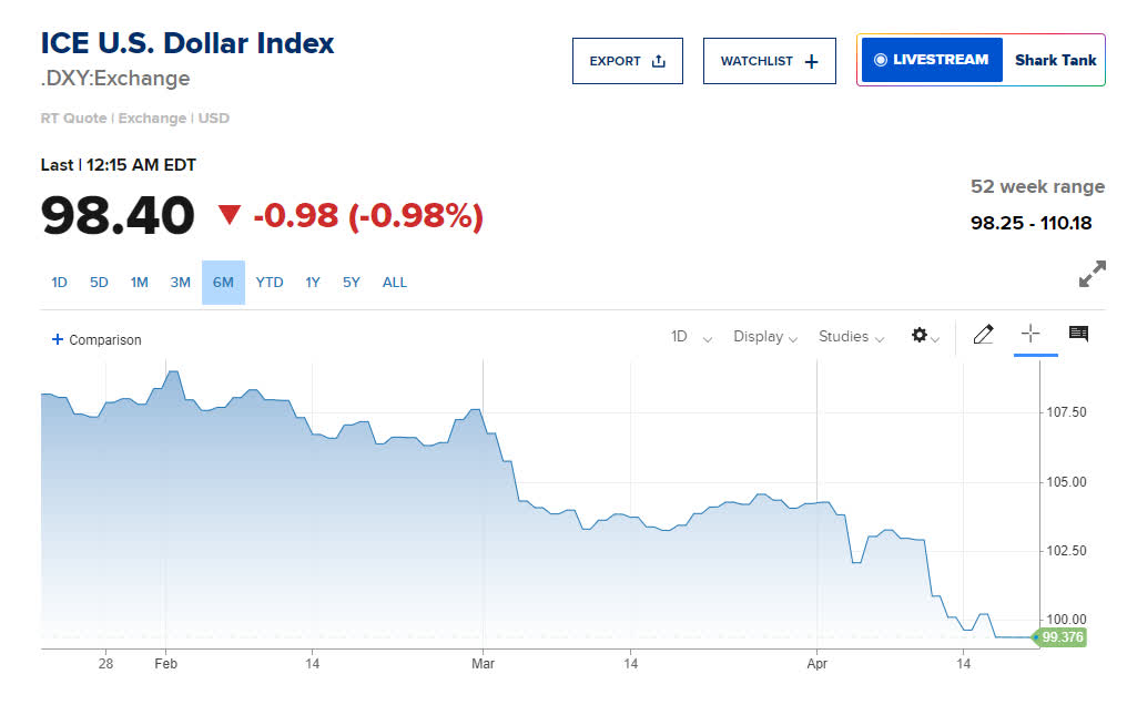 據央視新聞報道,衡量美元對六種主要貨幣匯率變化的美元指數過去數月來大幅震盪走低。截至北京時間4月21日12時,洲際交易所美元指數報98.40,跌幅0.98%,跌破99關口,為2022年4月以來首次。