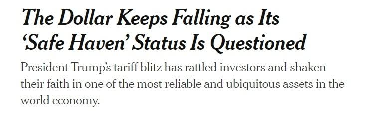 《紐約時報》近期分析稱,美元持續下跌,可能表明投資者開始避開長期以來被認作全球金融市場「避風港」的美元。