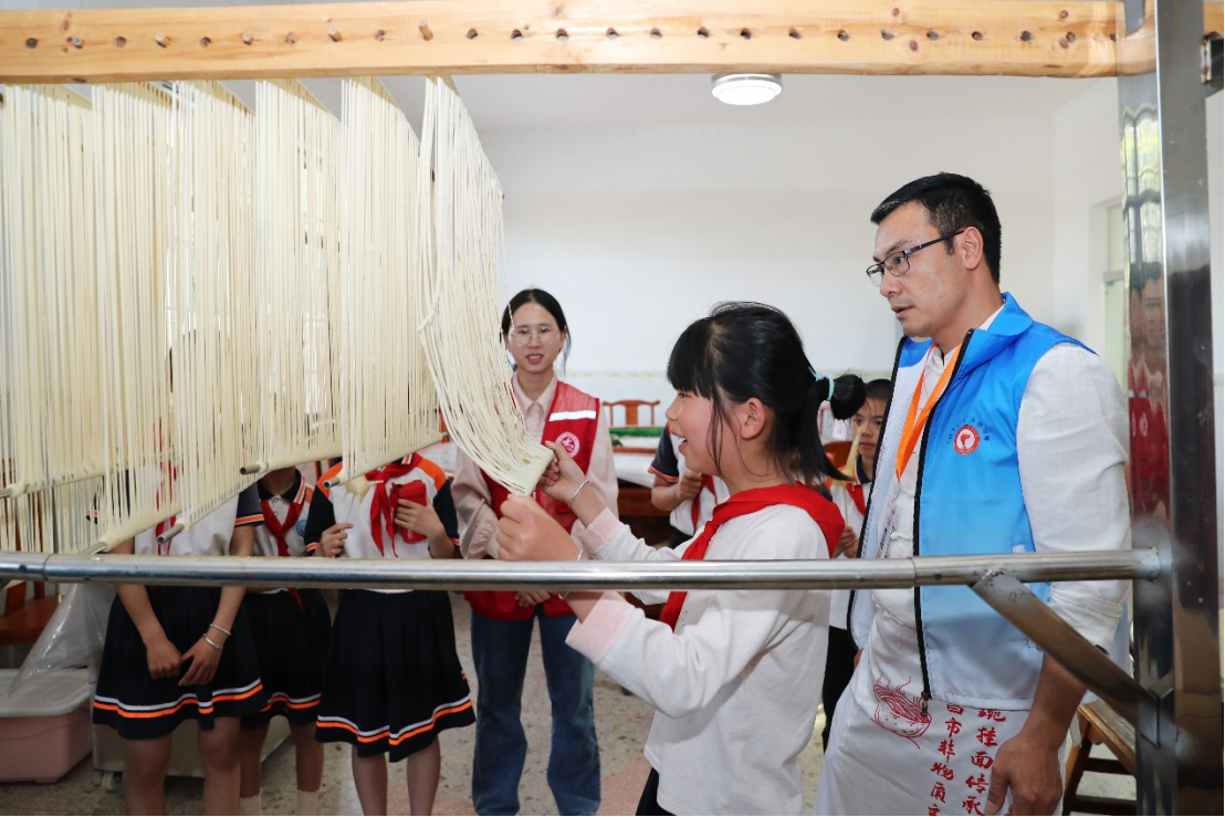 「拉麵的時候注意力道及速度,注意順着麵條的反作用力回彈上下拉動,要輕要柔。」「四個100」非遺傳承導師陳小余邊展示製作手工挂面技藝,邊手把手教孩子們上面、拉麵。陳老表手工挂面可追溯至清咸豐年間,整套流程繁雜而精妙,20餘道工序,經幾代改良,如今風味更加純正。