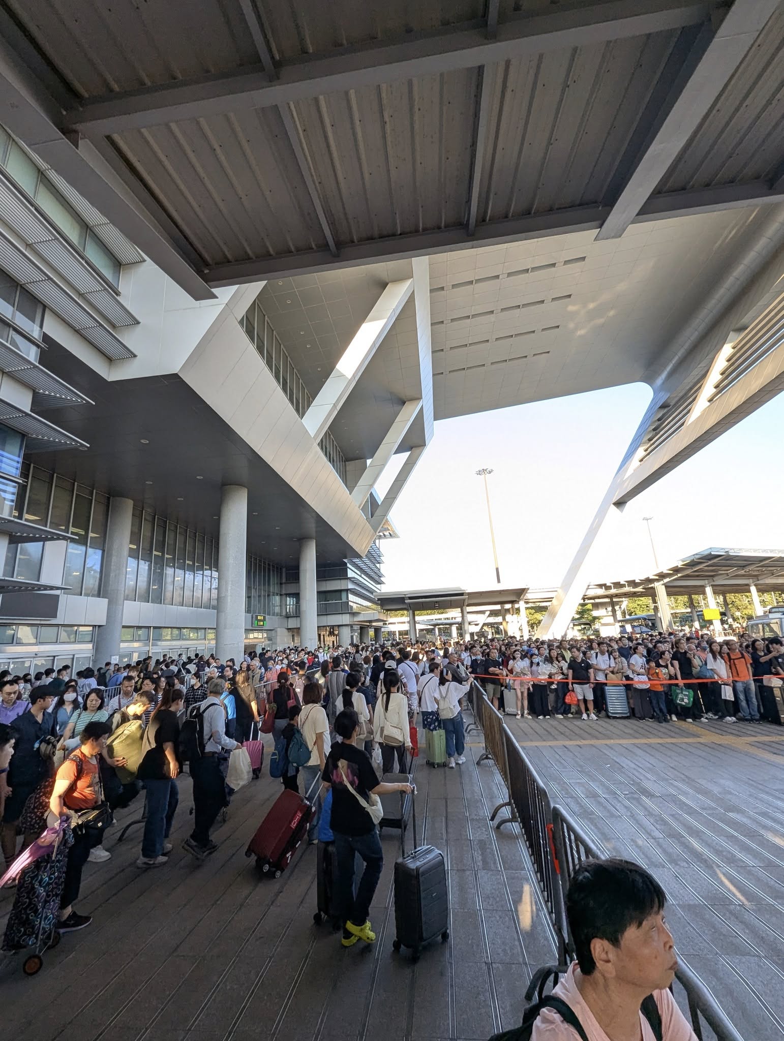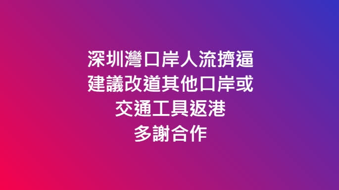 入境處指,截至下午4時,有超過55.5萬人次出入境,當中入境超過31萬人次,出境有約24.4萬人。此外,根據港珠澳大橋口岸通關資訊,下午6時25分汽車長龍達150米,需等候10分鐘過關,屬「繁忙」。