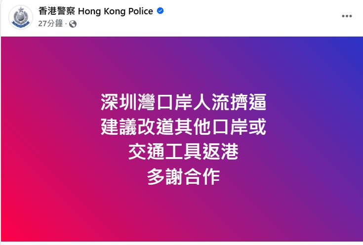 大公文匯全媒體報道,今日(21日)是復活節假期最後一日,大批港人外遊後回港。警方下午6時許在社交平台表示,深圳灣口岸人流擠迫,建議市民改以其他口岸或交通工具返港。有網民在社交群組分享深圳灣口岸實施情況,可見現場人頭湧湧。