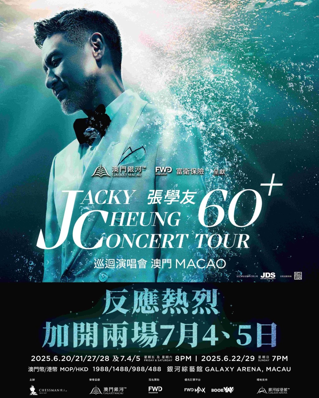 大公文匯全媒體報道,「歌神」張學友第十個個人演唱會《張學友 60+巡迴演唱會 澳門》將於今年6月在澳門銀河綜藝館連開6場,早前門票已火速售罄。主辦方宣布,是次澳門凱旋站將於7月4、5日加開兩場,並且早前售罄的首6場將特別加開極少量澳門幣1988元座位(視線受阻區)。門票將一同於4月22日中午12時公開發售。