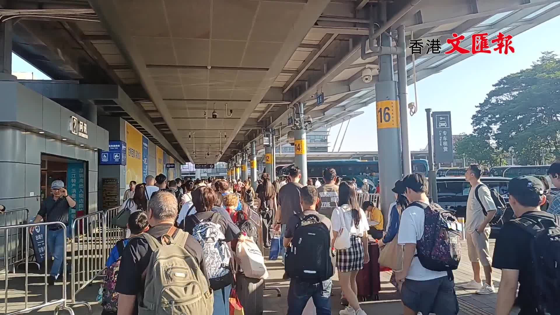 在深圳灣長途停車場,從大灣區其他城市駛來的中旅巴士、環島巴士等陸續停靠,眾多港人拖着行李箱、背着背包走下車。他們中,有的是三四口之家,有的則是五六人結伴,神色匆匆地趕往口岸過關返港。