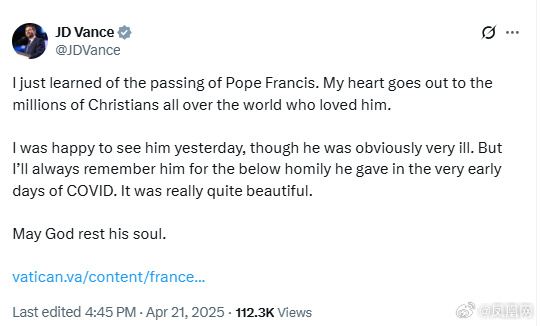 對此,萬斯在社交媒體「X」上寫道,「剛剛得知教皇方濟各去世的消息。我的心與世界各地數以百萬計愛他的教徒同在。萬斯稱,「儘管他當時顯然病重,但昨天見到他時我仍感到欣慰。願天主使他的靈魂安息。」