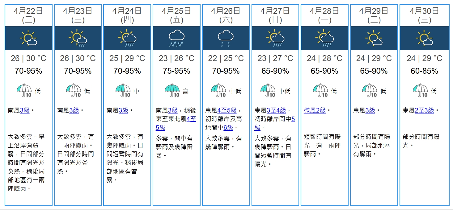 天文台表示,一股偏南氣流會在未來一兩日繼續為廣東沿岸帶來炎熱的天氣,該區亦有一兩陣驟雨。隨着覆蓋南海北部的高空反氣旋減弱及一道低壓槽於華南逐漸發展,本周中後期廣東有驟雨及雷暴。而一股清勁至強風程度的偏東氣流會在周末期間影響廣東沿岸,該區氣溫稍為下降。