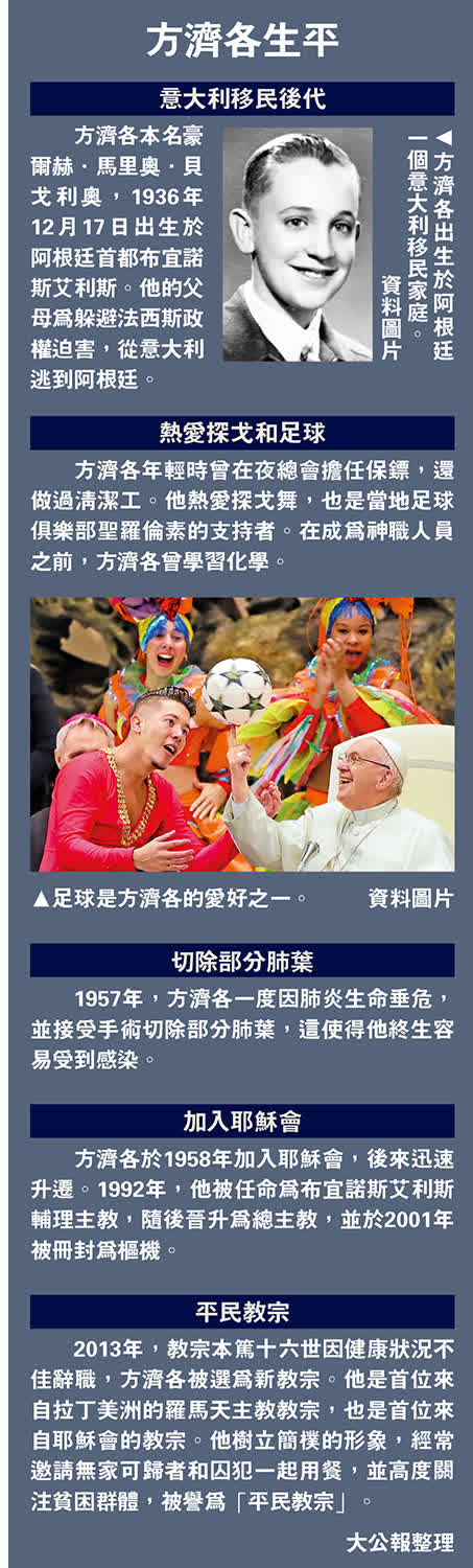 方濟各本名豪爾赫·馬里奧·貝戈利奧,1936年12月17日出生於阿根廷首都布宜諾斯艾利斯一個意大利移民家庭。他年輕時曾當過夜總會保鏢和清潔工,成為教宗後依然過着簡樸的生活,拒絕入住豪華的教宗官邸,並高度關注弱勢群體,被譽為「平民教宗」。方濟各被視為羅馬天主教會中「進步派」的代表人物,擔任教宗期間積極推動教會改革。