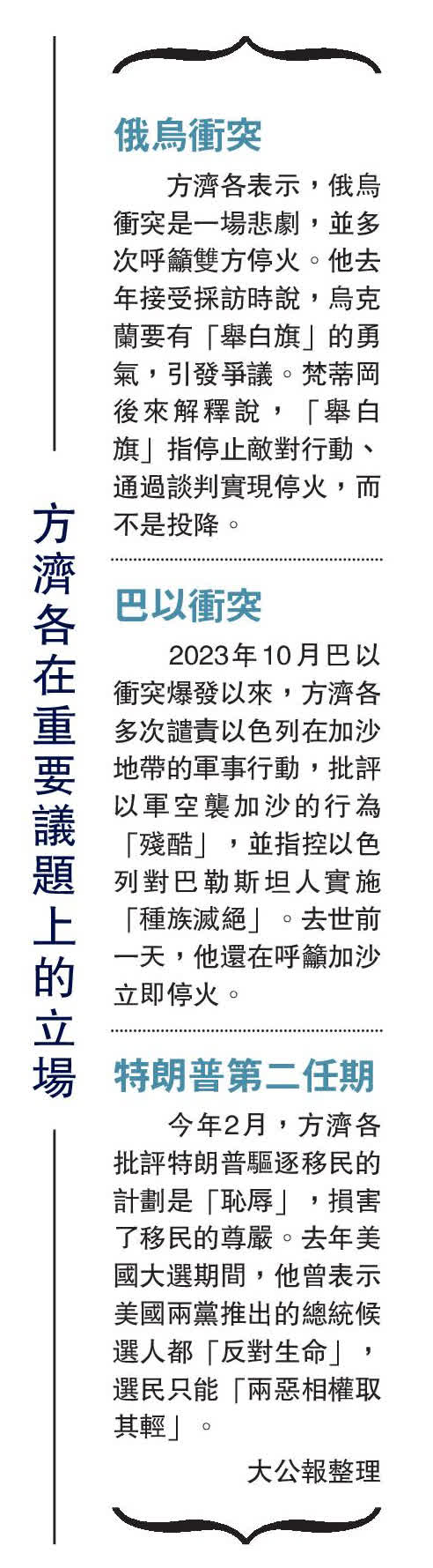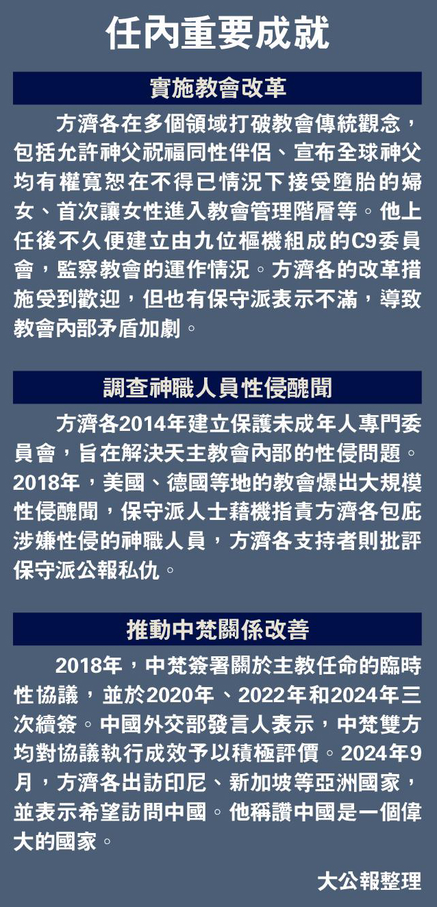 大公報報道,梵蒂岡方面證實,羅馬天主教第266任教宗方濟各於當地時間21日早上去世,享年88歲。方濟各在任12年,是首位出身於拉丁美洲的教宗。他生活簡樸,關心弱勢群體,推動教會改革,被譽為「平民教宗」。方濟各曾稱讚中國是一個偉大的國家,在他的任期內,中梵簽署關於主教任命的臨時性協議,並進行三次續簽。儘管健康狀況欠佳,方濟各近期仍堅持在俄烏衝突、巴以衝突等問題上發聲,呼籲實現和平,並批評美國總統特朗普驅逐移民的政策。