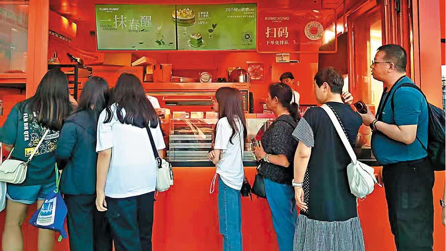 一路「買買買」的港人,在各大口岸附近也停不下來。羅湖口岸入口附近的一家蛋糕店吸引了眾多港人排隊購買。孫女士帶着兩個孩子在一旁等候,丈夫則在隊伍中排隊。她笑着說:「這家店的蛋糕、麵包口感特別好,鬆軟可口,特意買些給孩子們嘗嘗。」
