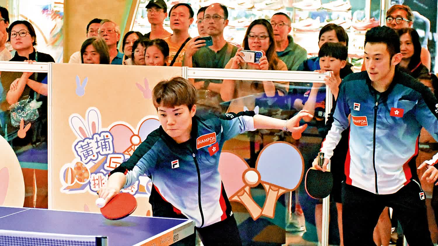 (大公報記者張銳)黃埔天地於復活節期間舉辦「黃埔乓FUN挑戰賽」,為6至12歲對乒乓球運動感興趣的小朋友提供更多體驗及實戰機會。昨天舉行的冠軍爭奪戰更特別邀請到中國香港乒乓球隊代表黃鎮廷及杜凱琹出席活動。兩人不僅擔任比賽評述,更親自與小朋友切磋,現場氣氛非常熱烈。