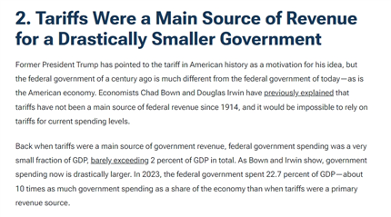 而且,一個世紀前的美國政府與今天大不相同。關稅是政府收入的主要來源時,聯邦政府支出僅佔GDP的很小一部分,僅略高於GDP總額的2%。2023年,聯邦政府支出佔GDP的22.7%,是之前百分比的十倍。所得稅帶來的收入顯然無法被關稅取代。