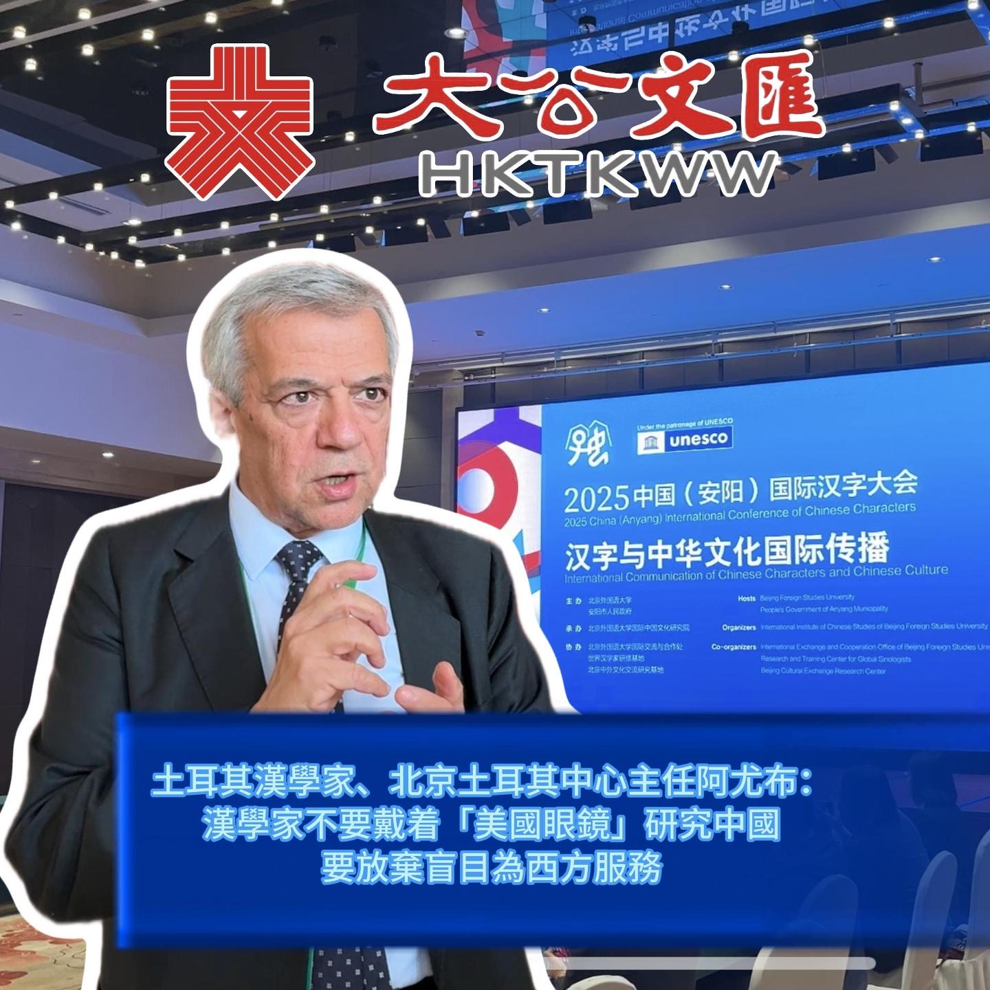 (大公文匯網 記者 劉蕊 實習生 任舜丞 河南報道)土耳其漢學家、北京土耳其中心主任阿尤布在2025中國(安陽)國際漢字大會召開期間接受記者專訪表示,漢學家不要戴着「美國眼鏡」研究中國,要放棄盲目為西方服務。