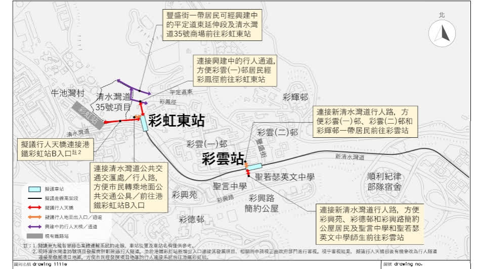系統將設9個車站,在技術可行及空間容許的情況下,車站將設於人流較集中和便捷的位置。而接駁至車站的行人連接設施及車站的出入口位置將充分考慮加強與各人流集中地的連接,方便市民更便捷地使用系統。