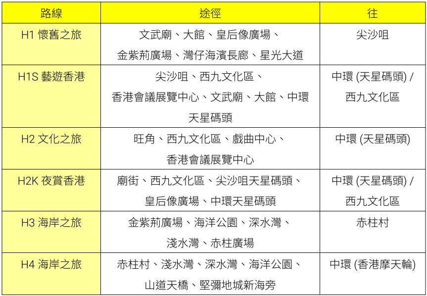 「觀光城巴」現時共有6條路線,包括與旅發局聯乘推出的「H1S藝遊香港」路線,穿梭於港九的藝文熱點;「H3及H4海岸之旅」路線則沿途飽覽城市與山水壯麗景色,陪伴乘客探尋歷史韻味。