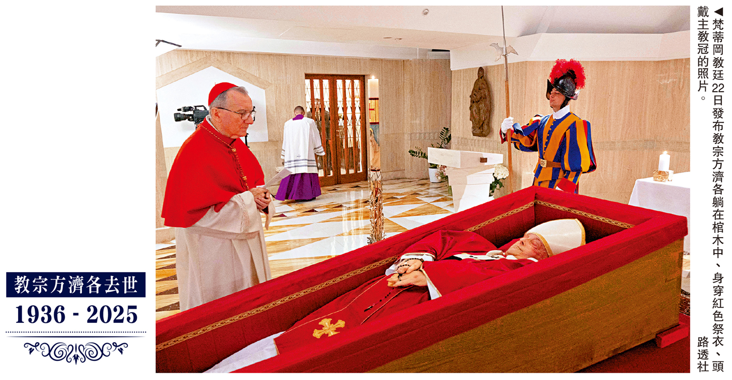 梵蒂岡教廷22日發布教宗躺在棺木中、身穿紅色祭衣、頭戴主教冠、手握念珠的遺容照片。教廷發言人表示,教宗靈柩將於當地時間23日上午9時移至聖伯多祿大教堂,供信眾瞻仰,直至舉行葬禮;教宗葬禮將於當地時間26日上午10時在聖伯多祿大教堂舉行。