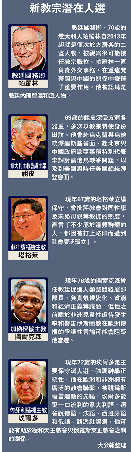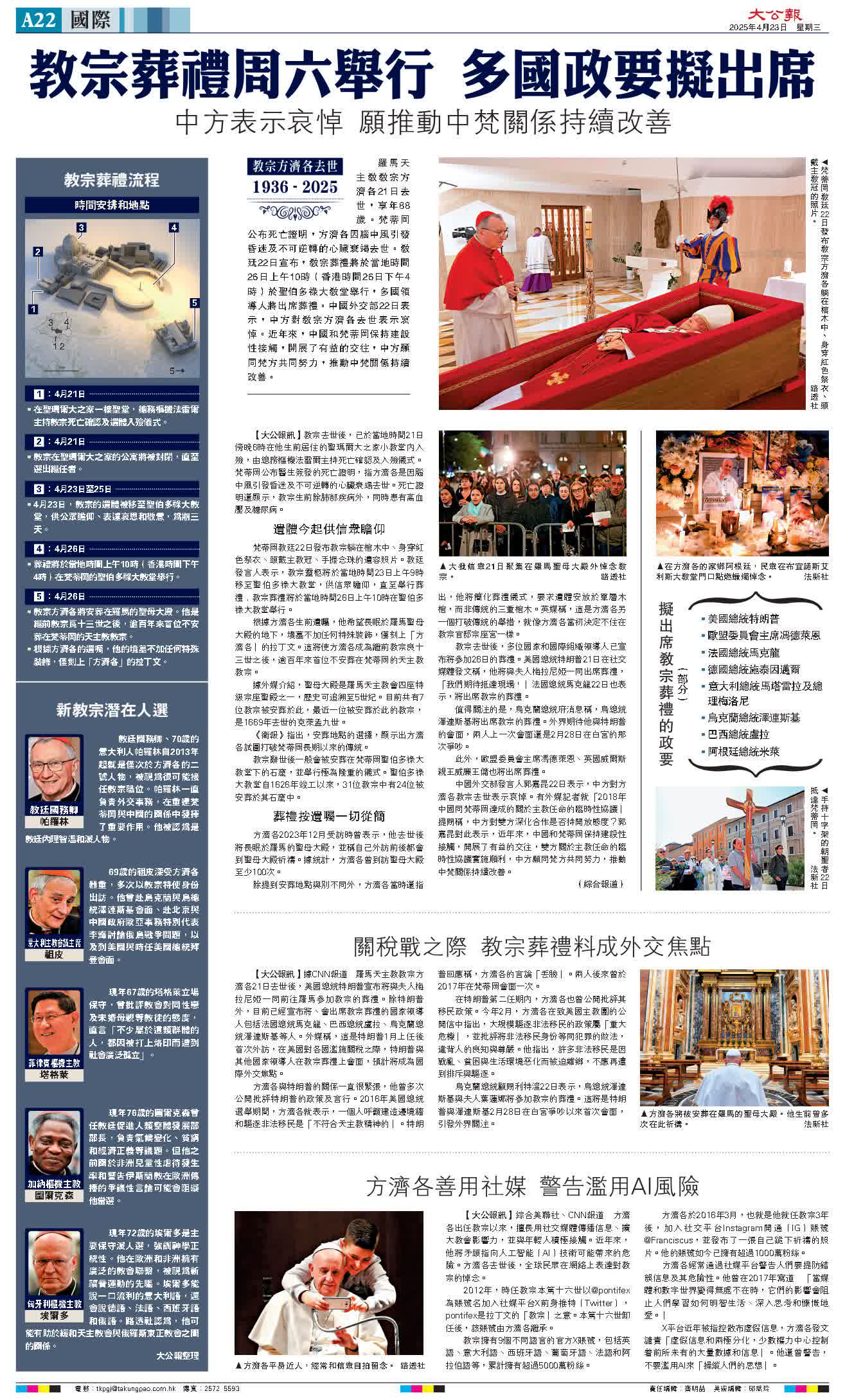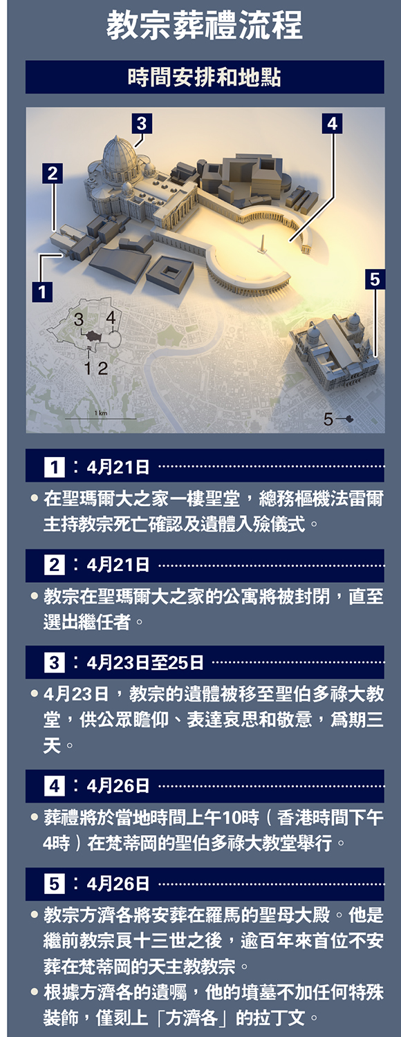 大公報綜合報道,羅馬天主教教宗方濟各21日去世,享年88歲。梵蒂岡公布死亡證明,方濟各因腦中風引發昏迷及不可逆轉的心臟衰竭去世。教廷22日宣布,教宗葬禮將於當地時間26日上午10時(香港時間26日下午4時)於聖伯多祿大教堂舉行,多國領導人將出席葬禮。