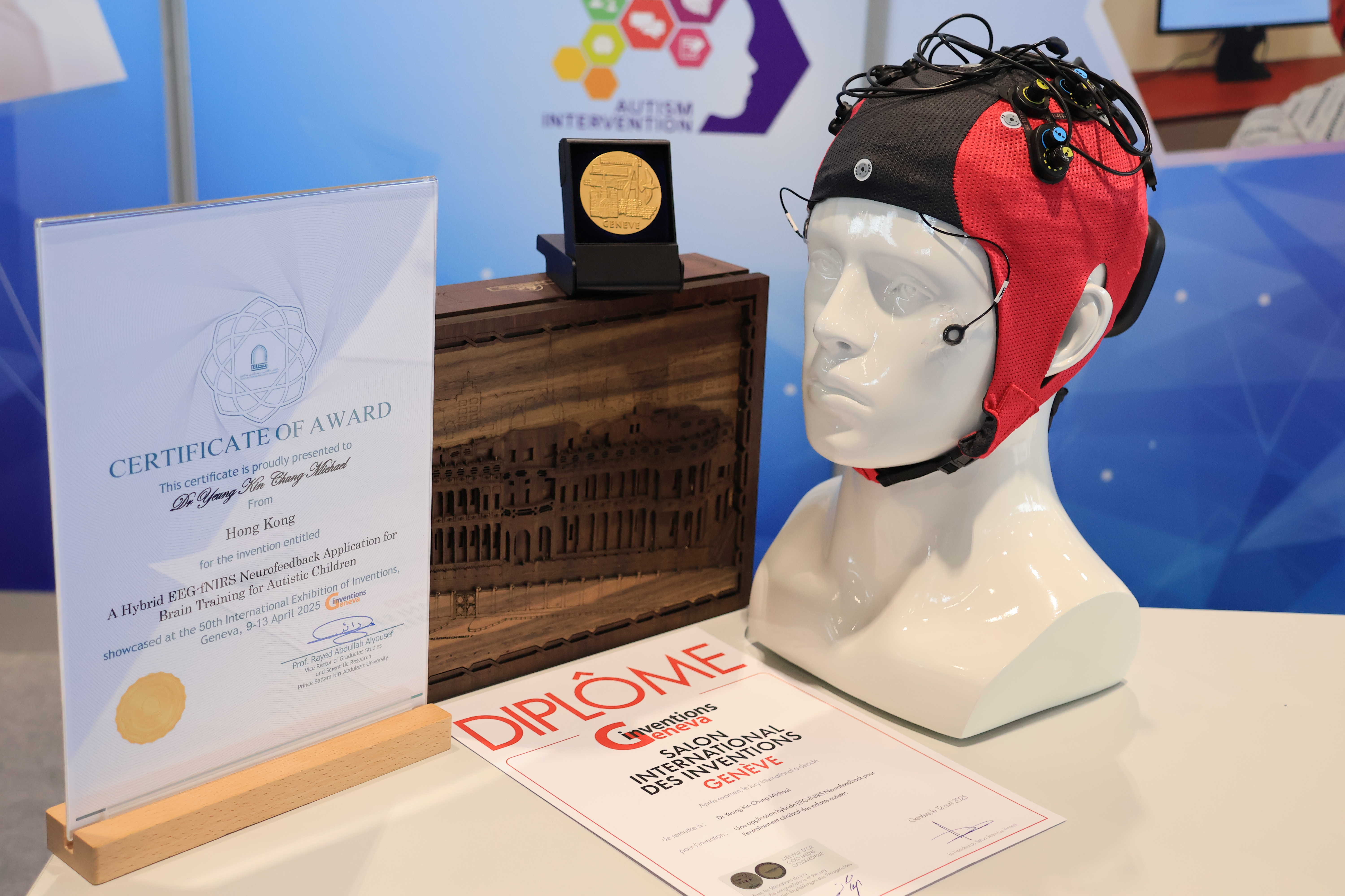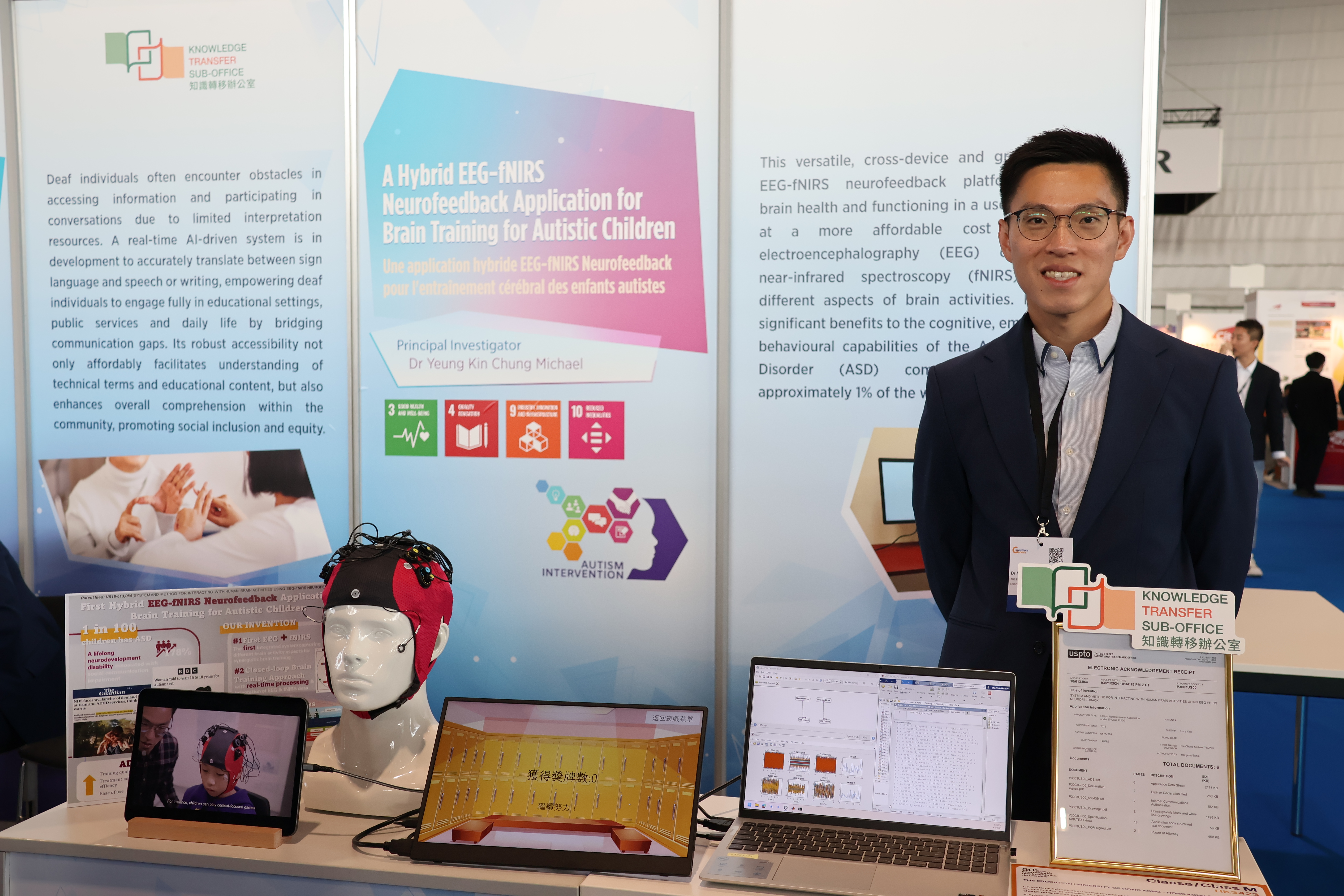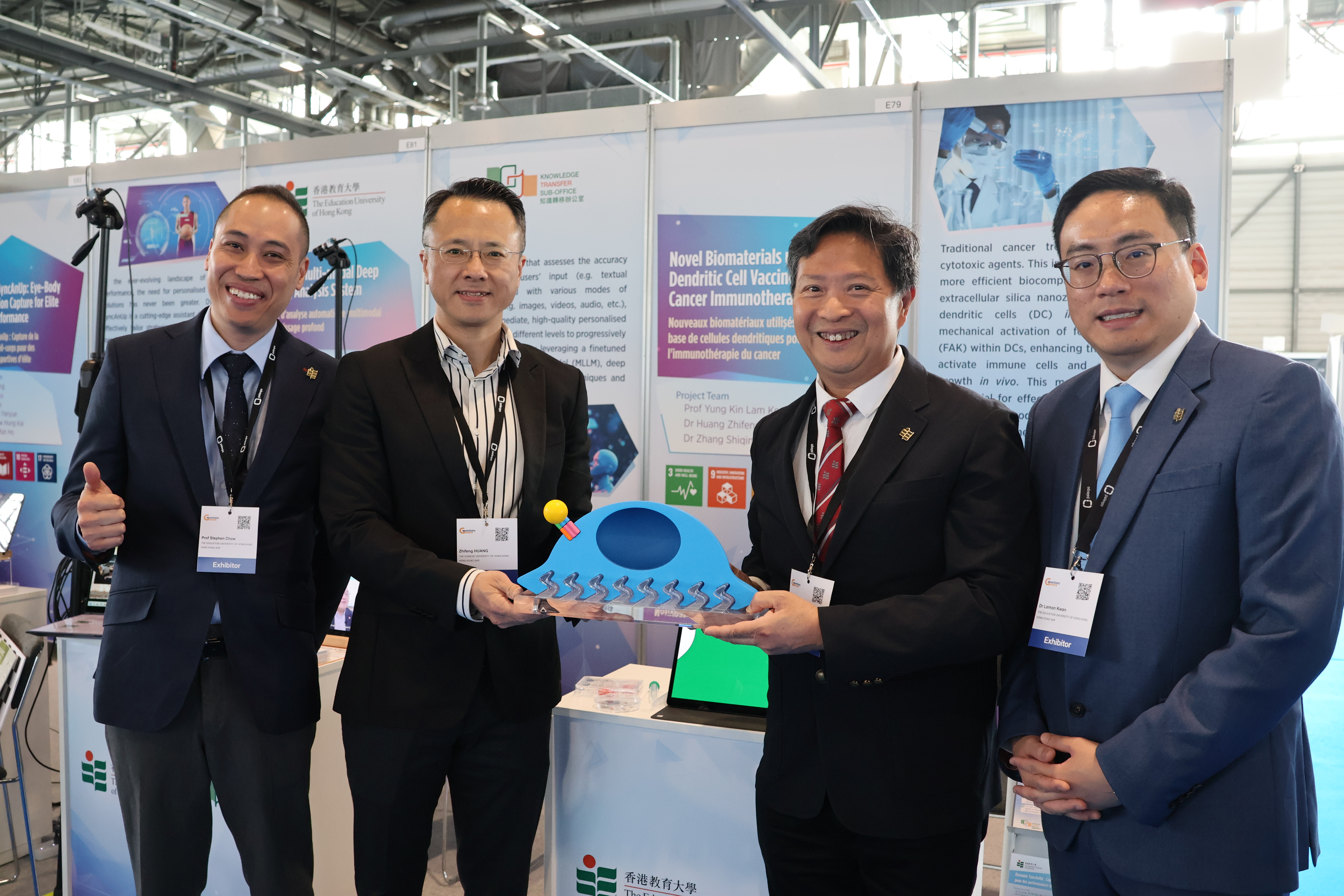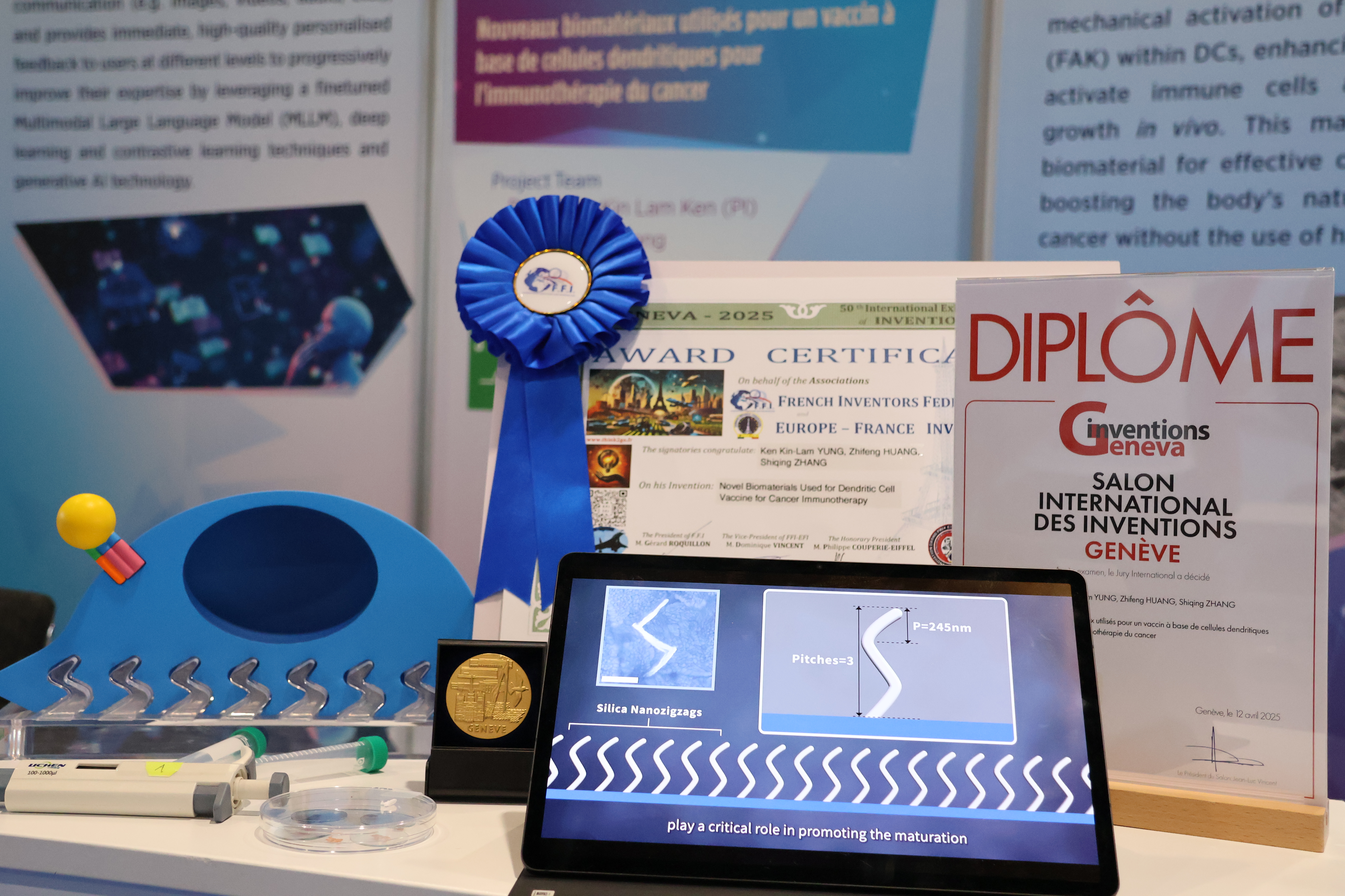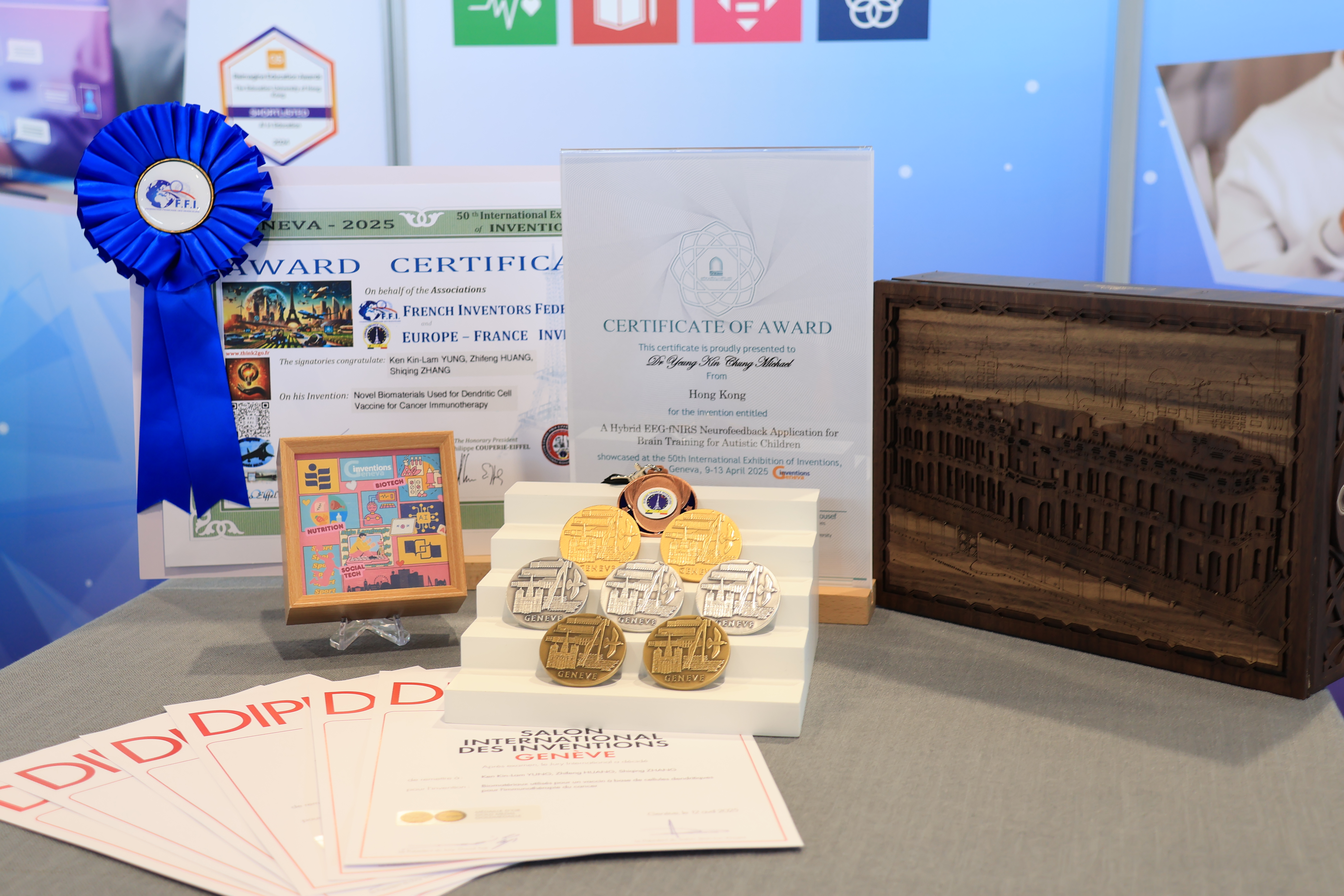 是次發明展中,獲得國際特別優異獎的兩個項目均隸屬神經科學領域,來自教大2024年新成立的神經科學中心實驗室(University Research Facility of Human Behavioural Neuroscience,UHBN)。其中「用於自閉症兒童大腦訓練的EEG-fNIRS神經反饋應用程式」,由教大心理學系助理教授楊健忠博士研發,榮獲評審團嘉許金獎及國際特別優異獎;另一項目是由協理副校長(研究)、神經科學中心實驗室總監及科學與環境學系生物與神經科學講座教授翁建霖教授研發的「用於癌症免疫治療的樹突狀細胞疫苗的新型生物材料」,榮獲金獎及國際特別優異獎。