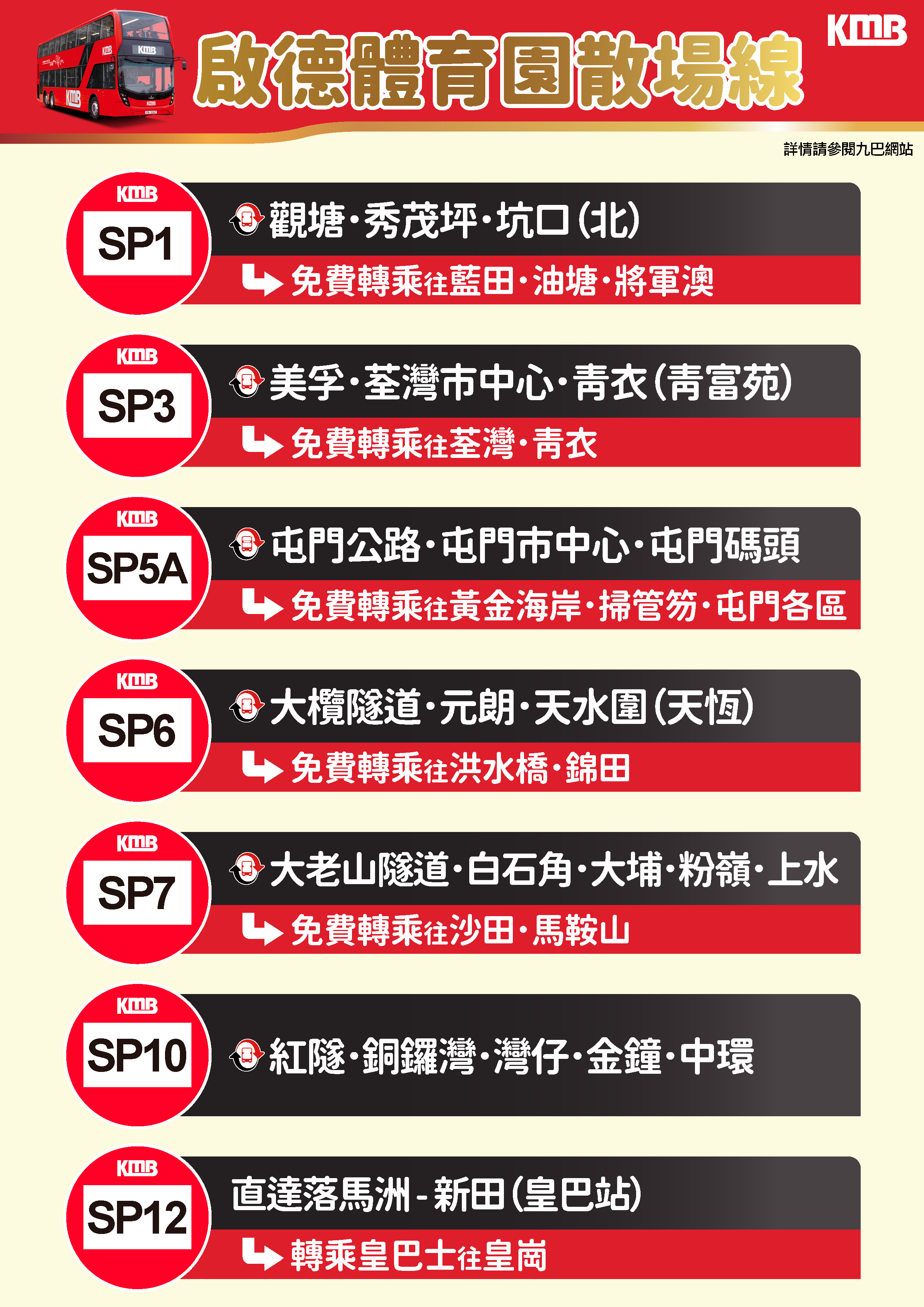 7條散場路線分別前往觀塘及將軍澳、荃灣及青衣、屯門、天水圍及元朗、大埔及上水、銅鑼灣及中環,路線SP12一站直達新田皇巴站。