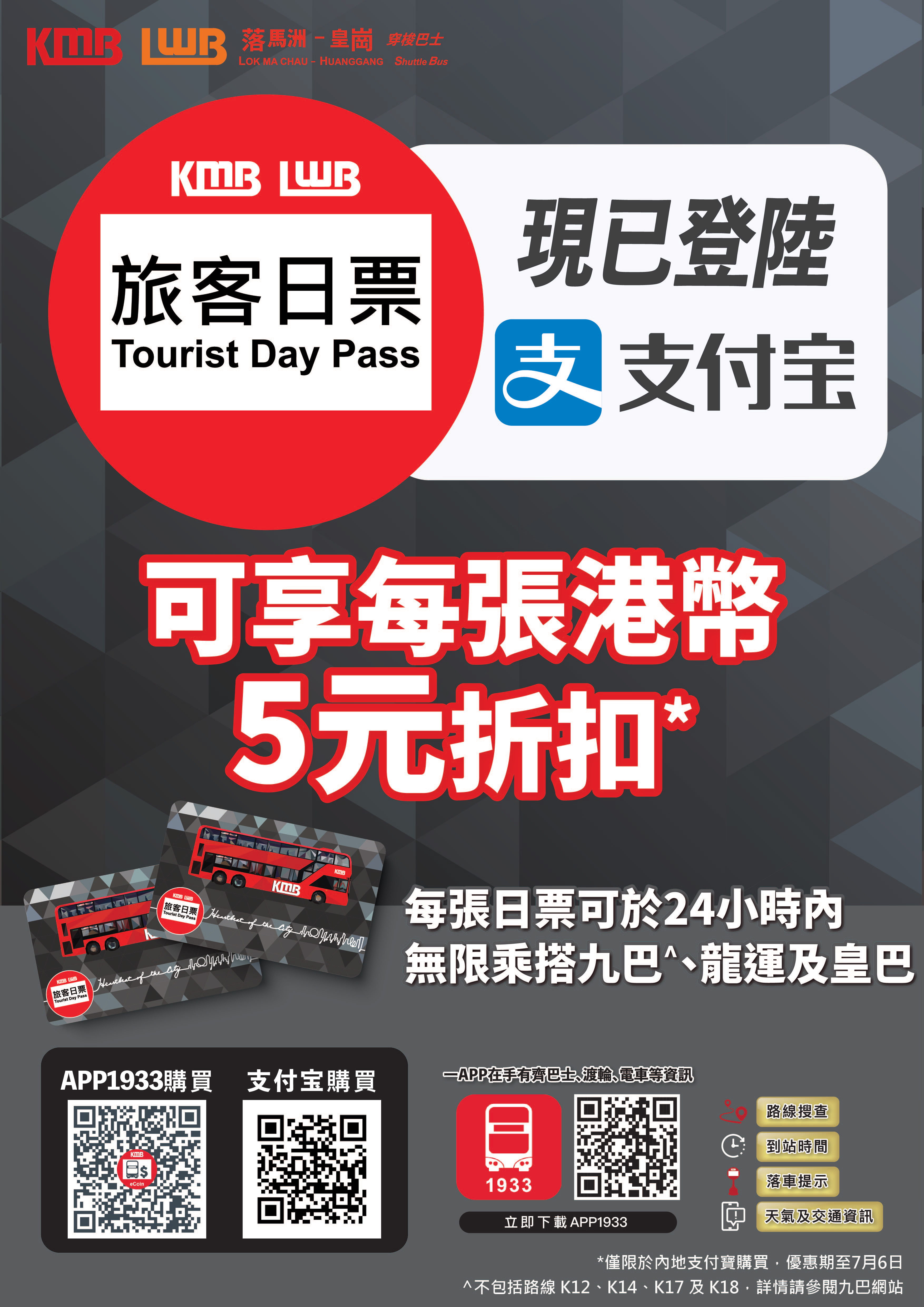 另外,九巴「旅客日票」現已登陸內地支付寶「好賞買商店平台」小程序,並已擴展至「皇巴士」,旅客持「旅客日票」,可於啟動後的24小時內無限次乘坐九巴(包括啟德散場路線九巴班次)、龍運逾450條路線(K12、K14、K17、K18路線除外)及「皇巴士」,內地旅客出發來港前,在相關平台購買,可享每張日票港幣5元的折扣,只需港幣50元便可來回深圳及香港(優惠期至7月6日)。