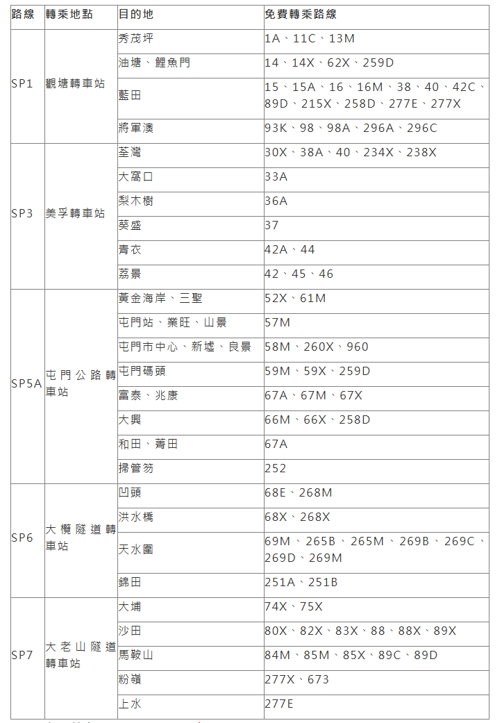 路線SP1、SP3、SP5A、SP6及SP7途經不同轉車站,乘客憑同一張八達通卡或電子支付方式轉乘指定九巴路線,可享有第二程車資免費的優惠;此外,九巴月票同樣適用於各路線(包括路線SP10、SP12九巴班次),往返各區更輕鬆便捷。
