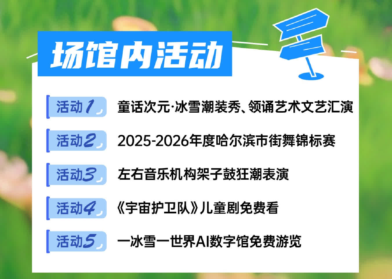 為期5天的風箏節,四季冰雪項目場館裏同樣熱鬧非凡。冰雪美食館中心舞台將上演「童話次元·冰雪潮裝秀」、舉辦「2025-2026年度哈爾濱市街舞錦標賽」,左右音樂機構架子鼓狂潮表演震撼來襲,還有領誦藝術文藝匯演帶來視聽盛宴;四季遊樂館二樓,小朋友們喜歡的兒童劇《宇宙護衛隊》免費看;一冰雪一世界AI數字館免費遊覽,夢幻冰雪館還將舉辦「冰雪情書·浪漫予你」打卡活動。