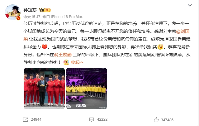 孫穎莎在社交平台發文,「經歷過勝利的榮耀,也經歷過低谷的迷茫,正是在您的培養、關懷和注視下,我一步一個腳印地成長為今天的自己,每一步腳印都離不開您的信任和培養。」她感謝劉國梁讓她實現為國而戰的夢想,她將帶着這份榮耀和沉甸甸的責任,繼續為捍衛國乒榮耀拚盡全力。同時,孫穎莎恭喜馬龍新身份,也相信在王勵勤主席的帶領下,國乒團隊將在新的奧運周期繼續所向披靡,從勝利走向新的勝利。