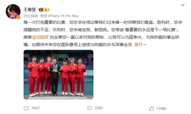 王曼昱之後也在社交平台發文,「每一次打完重要的比賽,您總會在場邊等我們過來第一時間幫我們復盤。勝利時,您會提醒我的不足;失利時,您會肯定我、鼓勵我。您常說『最重要的永遠是下一場比賽』。」她感謝劉國梁一直以來對她的幫助,讓她可以為國爭光,為她熱愛的事業拚搏。也期待劉國梁未來在國際賽場上繼續為熱愛的乒乓球事業發光發亮。王曼昱指,她也會繼續努力奮鬥,為國而戰,相信在王勵勤的帶領下,國乒會再創輝煌。