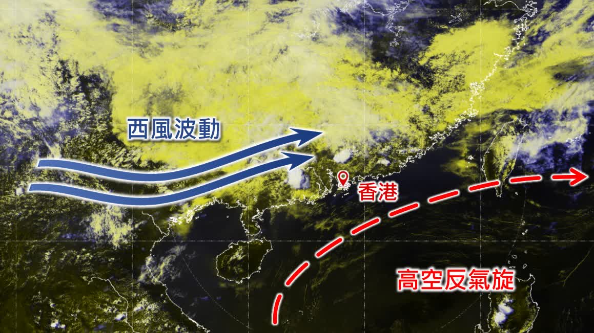 天文台指,受偏南氣流及高空反氣旋影響,過去兩三日廣東天氣炎熱。但覆蓋沿岸地區的高空反氣旋會在未來一兩日減弱南退,該區將受到西風波動影響,而一道低壓槽會在明日於華南內陸發展,並為該區帶來不穩定天氣。