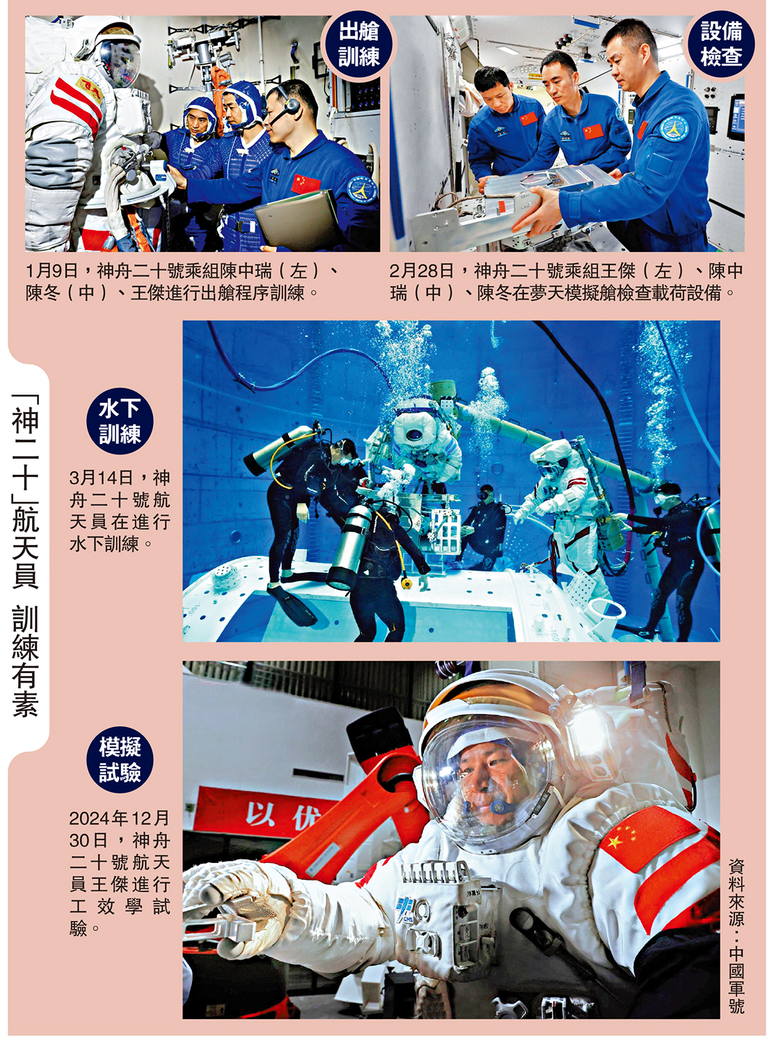 中國航天員大隊大隊長陳冬,副大隊長陳中瑞同時入選同一乘組,曾為空間站建造者的王傑將作為飛行工程師入駐空間站。神二十乘組將以零失誤、零差錯為標準完成本職工作列為本次太空之旅最重要的任務。