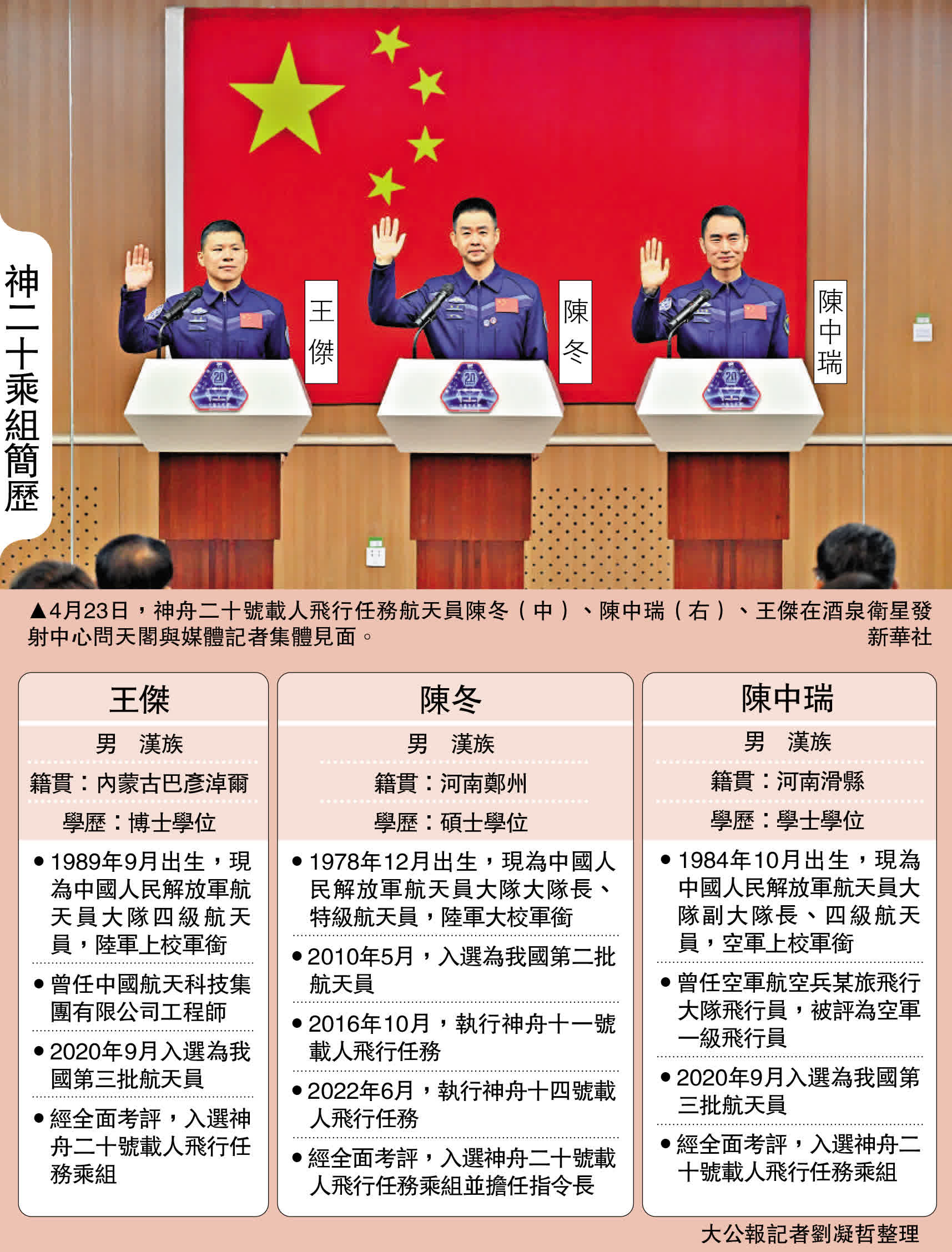 (大公報記者 劉凝哲)今天(4月24日)正值第十個「中國航天日」,神舟二十號載人飛船瞄準今日17時17分發射。中國載人航天工程辦公室副主任、中國載人航天工程新聞發言人林西強昨日(23日)表示,執行神舟二十號載人飛行任務的航天員乘組由陳冬、陳中瑞、王傑3名航天員組成。神二十乘組在軌期間,將開展3項生命科學實驗,其中,渦蟲空間再生實驗是國內首次開展,除了上述3項生物實驗外,還將持續開展59項空間科學實驗與技術試驗,有望在高溫超導材料空間製備研究等方面取得重要突破。
