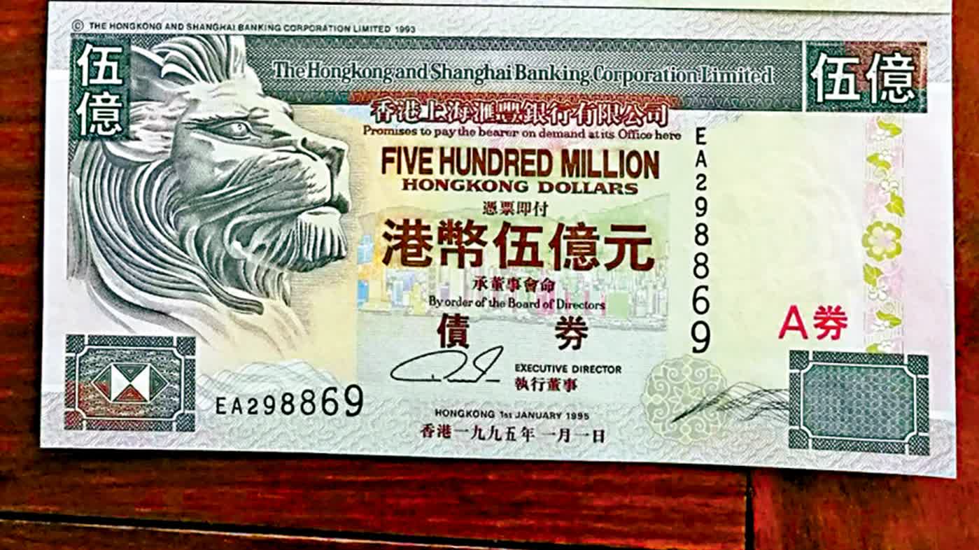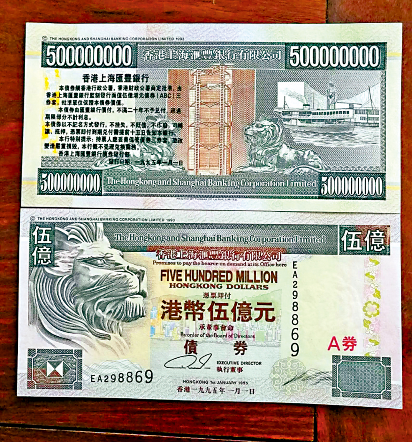 從部分圖片可見,「債券」上列出的發行日期為1995年1月1日,聲稱「由香港行政公署、財政公署商定批準(准)」,匯(滙)豐發行;債券為20年期,「不滿二十年不予兌付」。亦有圖片顯示,銀行名稱為「香港國際貨幣有限公司」,圖案與滙豐銀行鈔票無異。