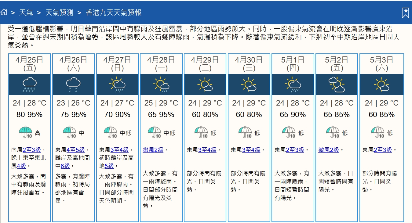天文台指出,受一道低壓槽影響,明日華南沿岸間中有驟雨及狂風雷暴,部分地區雨勢頗大。同時,一股偏東氣流會在明晚逐漸影響廣東沿岸,並會在周末期間稍為增強,該區風勢較大及有幾陣驟雨,氣溫稍為下降。