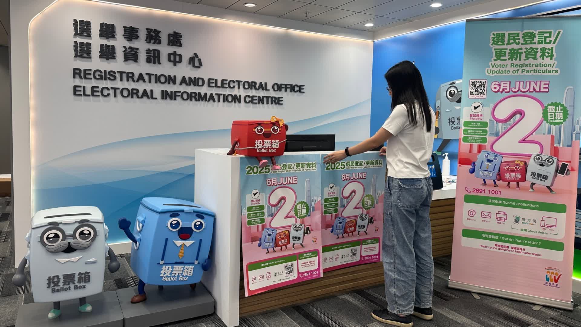 政制及內地事務局表示,過去一段時間,選舉事務處一直密鑼緊鼓籌備有關宣傳工作,包括為選民登記幹事和助理舉辦工作簡介會、在入境事務處總部設立選民登記櫃枱、整理登記櫃枱和流動登記站的物資、安排在全港多個地區張掛大型橫額和海報,以及在多個地點的電子屏幕展示宣傳訊息,以呼籲合資格市民於6月2日或之前登記成為選民或更新選民登記資料。