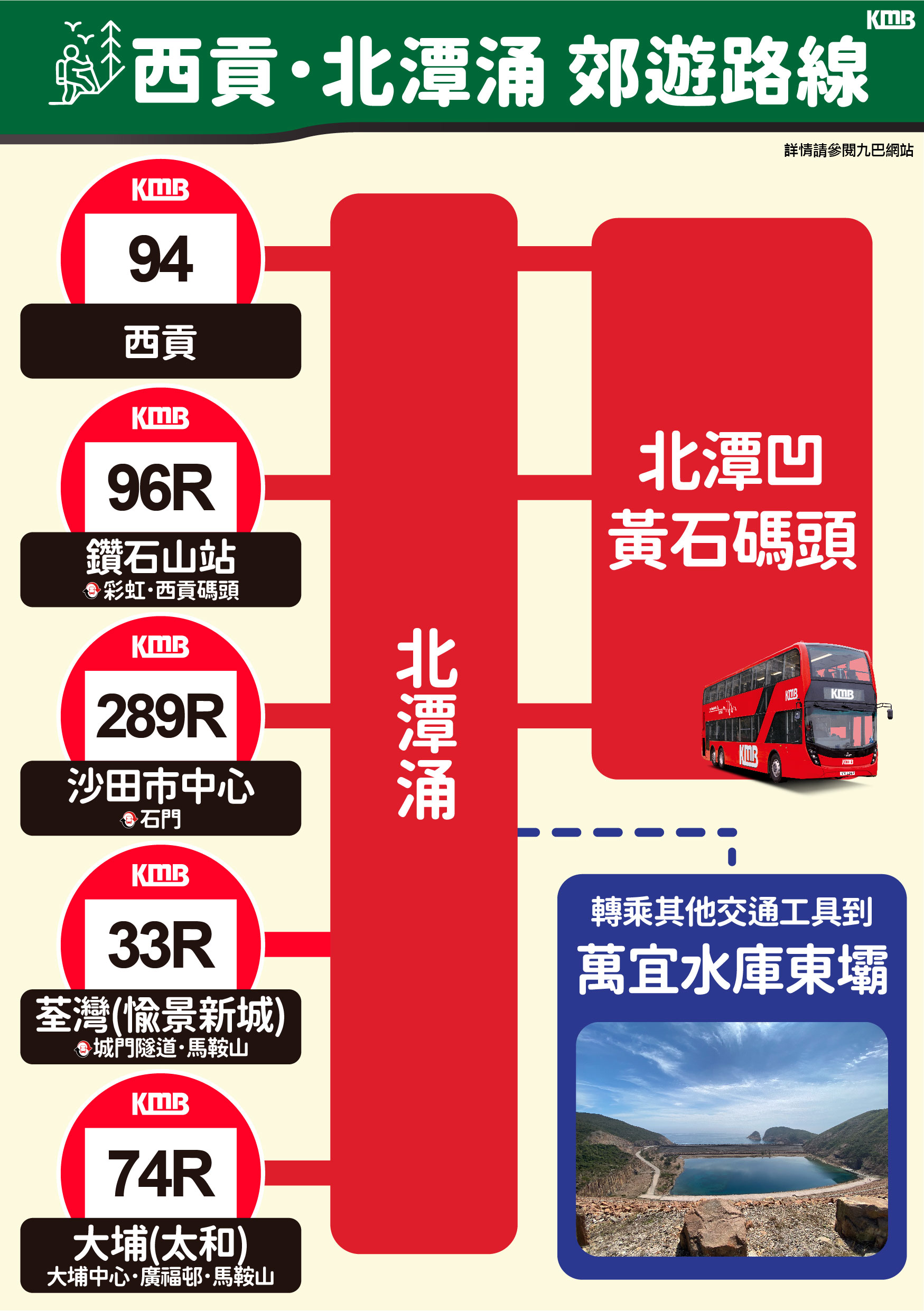 由九龍出發的遊人,可乘搭路線96R,途經彩虹及牛池灣轉車站,班次最密至20分鐘一班;從新界西出發則可乘搭路線33R,路線途經城門隧道轉車站。至於從新界東出發,除路線289R外,亦可乘搭路線74R,途經太和站、大埔中心、廣福邨,於北潭涌轉乘路線94、96R或289R前往北潭凹及黃石碼頭。路線33R及74R加強至最密20分鐘一班。