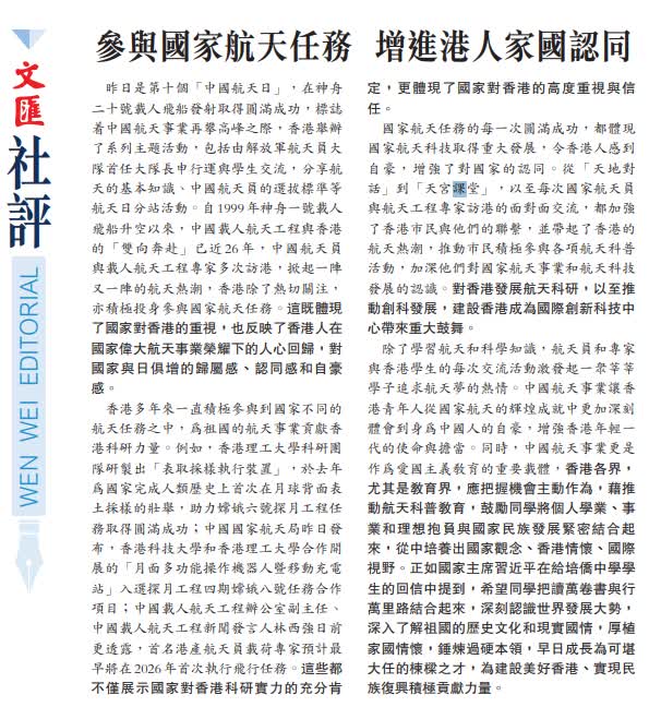 昨日是第十個「中國航天日」,在神舟二十號載人飛船發射取得圓滿成功,標誌着中國航天事業再攀高峰之際,香港舉辦了系列主題活動,包括由解放軍航天員大隊首任大隊長申行運與學生交流,分享航天的基本知識、中國航天員的選拔標準等航天日分站活動。自1999年神舟一號載人飛船升空以來,中國載人航天工程與香港的「雙向奔赴」已近26年,中國航天員與載人航天工程專家多次訪港,掀起一陣又一陣的航天熱潮,香港除了熱切關注,亦積極投身參與國家航天任務。這既體現了國家對香港的重視,也反映了香港人在國家偉大航天事業榮耀下的人心回歸,對國家與日俱增的歸屬感、認同感和自豪感。