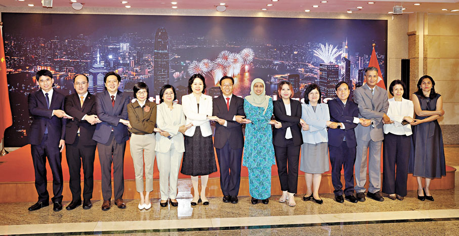 (香港文匯報記者 胡恬恬〈文〉 郭木又〈圖〉)為進一步深化中國與東盟全面戰略夥伴關係,推動粵港澳大灣區與東盟區域合作,中國—東盟聯合合作委員會代表團於本月23日至24日訪問香港。訪港期間,代表團與特區政府主要官員、立法會主席和其他主要機構代表會面交流,並參觀超級一號貨站和立法會。在代表團結束訪港行程轉往深圳繼續訪問時,外交部駐港特派員公署昨日傍晚設宴款待大家。特派員崔建春在晚宴上致辭時表示,此次訪問是東盟深入了解香港的好機會,他期待代表團通過行程愛上香港,希望東盟國家深化與香港合作,共同把握粵港澳大灣區與「一帶一路」機遇,開創互利共贏新格局。